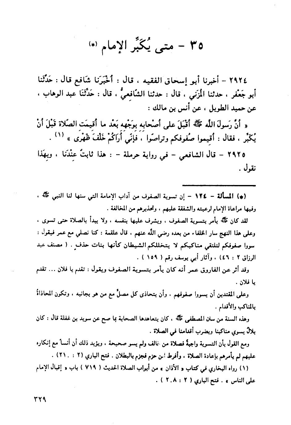 2924 - أَخْبَرَنَا أَبُو إِسْحَاقَ الْفَقِيهُ قَالَ: أَخْبَرَنَا شَافِعٌ قَالَ: حَدَّثَنَا أَبُو جَعْفَرٍ، حَدَّثَنَا الْمُزَنِيُّ قَالَ: حَدَّثَنَا الشَّافِعِيُّ قَالَ: حَدَّثَنَا عَبْدُ الْوَهَّابِ، عَنْ حُمَيْدٍ الطَّوِيلِ، عَنْ أَنَسِ بْنِ مَالِكٍ: أَنَّ رَسُولَ اللَّهِ صَلَّى اللهُ عَلَيْهِ وَسَلَّمَ، أَقْبَلَ عَلَى أَصْحَابِهِ بِوَجْهِهِ بَعْدَمَا أُقِيمَتِ الصَّلَاةُ قَبْلَ أَنْ يُكَبِّرَ، فَقَالَ: «§أَقِيمُوا صُفُوفَكُمْ وَتَرَاصُّوا، فَإِنِّي أَرَاكُمْ خَلْفَ ظَهْرِي»