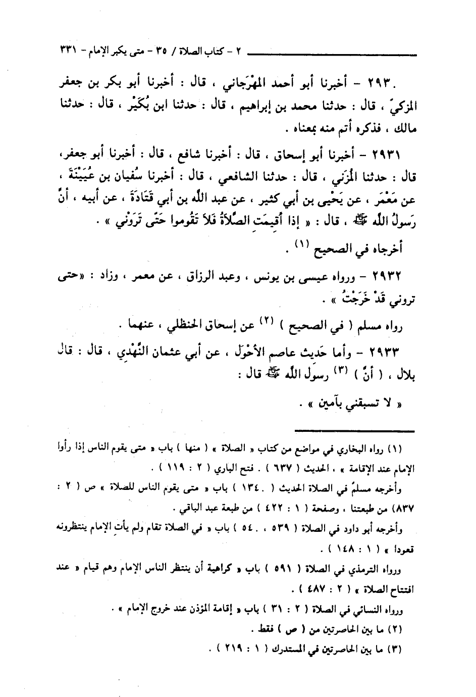 2931 - أَخْبَرَنَا أَبُو إِسْحَاقَ قَالَ: أَخْبَرَنَا شَافِعٌ قَالَ: أَخْبَرَنَا أَبُو جَعْفَرٍ قَالَ: حَدَّثَنَا الْمُزَنِيُّ قَالَ: حَدَّثَنَا الشَّافِعِيُّ قَالَ: أَخْبَرَنَا سُفْيَانُ بْنُ عُيَيْنَةَ، عَنْ مَعْمَرٍ، عَنْ يَحْيَى بْنِ أَبِي كَثِيرٍ، عَنْ عَبْدِ اللَّهِ بْنِ أَبِي قَتَادَةَ، عَنْ أَبِيهِ، أَنَّ رَسُولَ اللَّهِ صَلَّى اللهُ عَلَيْهِ وَسَلَّمَ قَالَ: § «إِذَا أُقِيمَتِ الصَّلَاةُ فَلَا تَقُومُوا حَتَّى تَرَوْنِي» أَخْرَجَاهُ فِي الصَّحِيحِ،