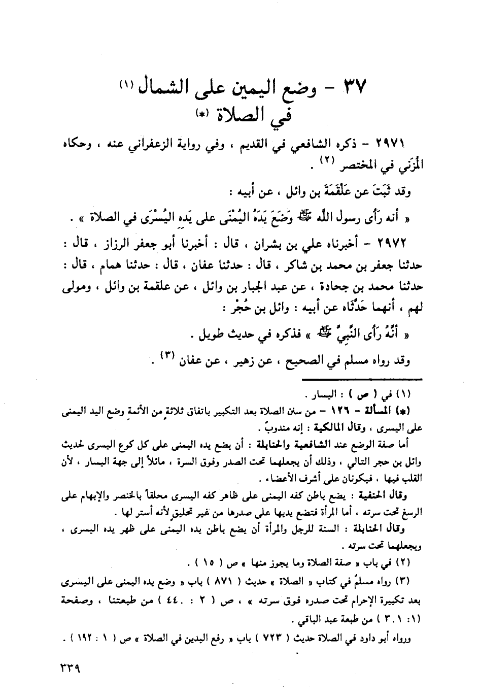2971 - ذَكَرَهُ الشَّافِعِيُّ فِي الْقَدِيمِ، وَفِي رِوَايَةِ الزَّعْفَرَانِيِّ عَنْهُ، وَحَكَاهُ الْمُزَنِيُّ فِي الْمُخْتَصَرِ، وَقَدْ ثَبَتَ عَنْ عَلْقَمَةَ بْنِ وَائِلٍ، عَنْ أَبِيهِ، أَنَّهُ: «رَأَى رَسُولَ اللَّهِ صَلَّى اللهُ عَلَيْهِ وَسَلَّمَ §وَضَعَ يَدَهُ الْيُمْنَى عَلَى يَدِهِ الْيُسْرَى فِي الصَّلَاةِ»