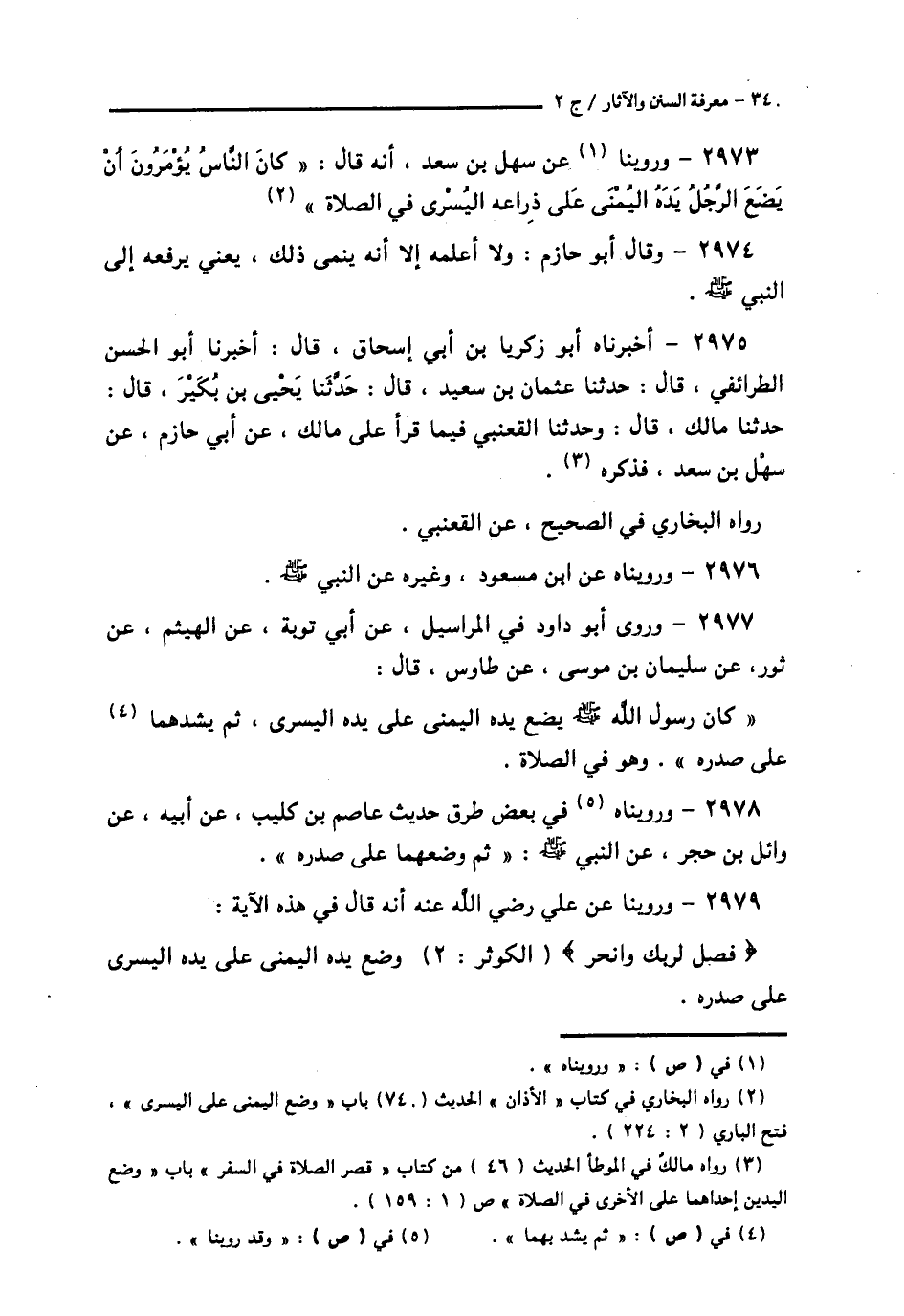 2973 - وَرُوِّينَا عَنْ سَهْلِ بْنِ سَعْدٍ، أَنَّهُ قَالَ: «كَانَ النَّاسُ §يُؤْمَرُونَ أَنْ يَضَعَ الرَّجُلُ يَدَهُ الْيُمْنَى عَلَى ذِرَاعِهِ الْيُسْرَى فِي الصَّلَاةِ»،