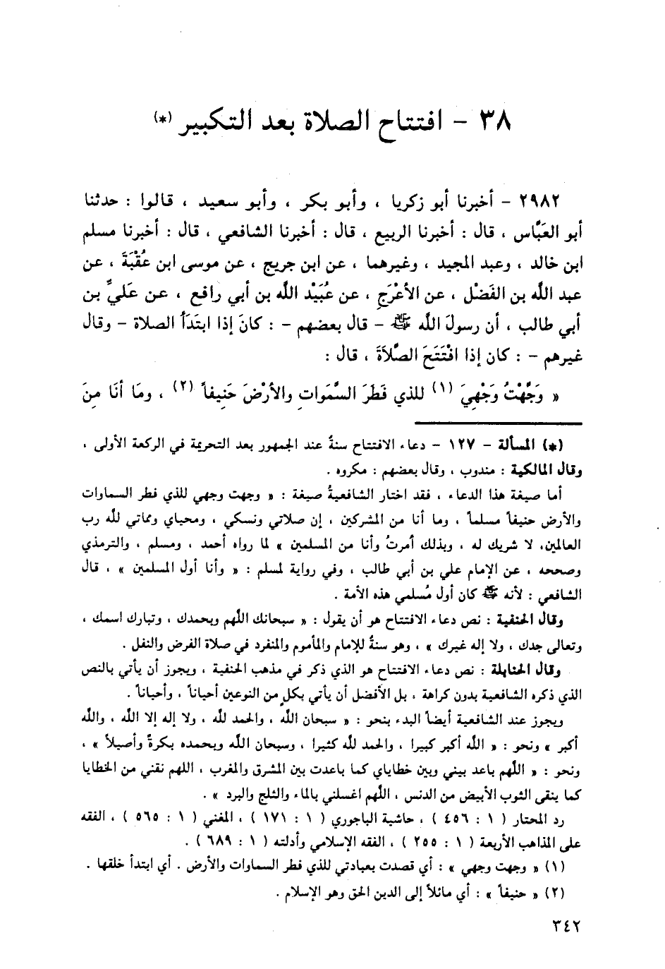 2982 - أَخْبَرَنَا أَبُو زَكَرِيَّا، وَأَبُو بَكْرٍ، وَأَبُو سَعِيدٍ، قَالُوا: حَدَّثَنَا أَبُو الْعَبَّاسِ قَالَ: أَخْبَرَنَا الرَّبِيعُ قَالَ: أَخْبَرَنَا الشَّافِعِيُّ قَالَ: أَخْبَرَنَا مُسْلِمُ بْنُ خَالِدٍ، وَعَبْدُ الْمَجِيدِ، وَغَيْرُهُمَا، عَنِ ابْنِ جُرَيْجٍ، عَنْ مُوسَى بْنِ عُقْبَةَ، عَنْ عَبْدِ اللَّهِ بْنِ الْفَضْلِ، عَنِ الْأَعْرَجِ، عَنْ عُبَيْدِ اللَّهِ بْنِ أَبِي رَافِعٍ، عَنْ عَلِيِّ بْنِ أَبِي طَالِبٍ، أَنَّ رَسُولَ اللَّهِ صَلَّى اللهُ عَلَيْهِ وَسَلَّمَ - قَالَ بَعْضُهُمْ -: كَانَ إِذَا ابْتَدَأَ الصَّلَاةَ، وَقَالَ غَيْرُهُمْ: كَانَ إِذَا افْتَتَحَ الصَّلَاةَ قَالَ: «§وَجَّهْتُ وَجْهِيَ لِلَّذِي فَطَرَ السَّمَاوَاتِ، وَالْأَرْضَ حَنِيفًا، وَمَا أَنَا مِنَ -[343]- الْمُشْرِكِينَ، إِنَّ صَلَاتِي وَنُسُكِي، وَمَحْيَايَ، وَمَمَاتِي لِلَّهِ رَبِّ الْعَالَمِينَ، لَا شَرِيكَ لَهُ، وَبِذَلِكَ أُمِرْتُ» قَالَ أَكْثَرُهُمْ: «وَأَنَا مِنْ أَوَّلِ الْمُسْلِمِينَ».