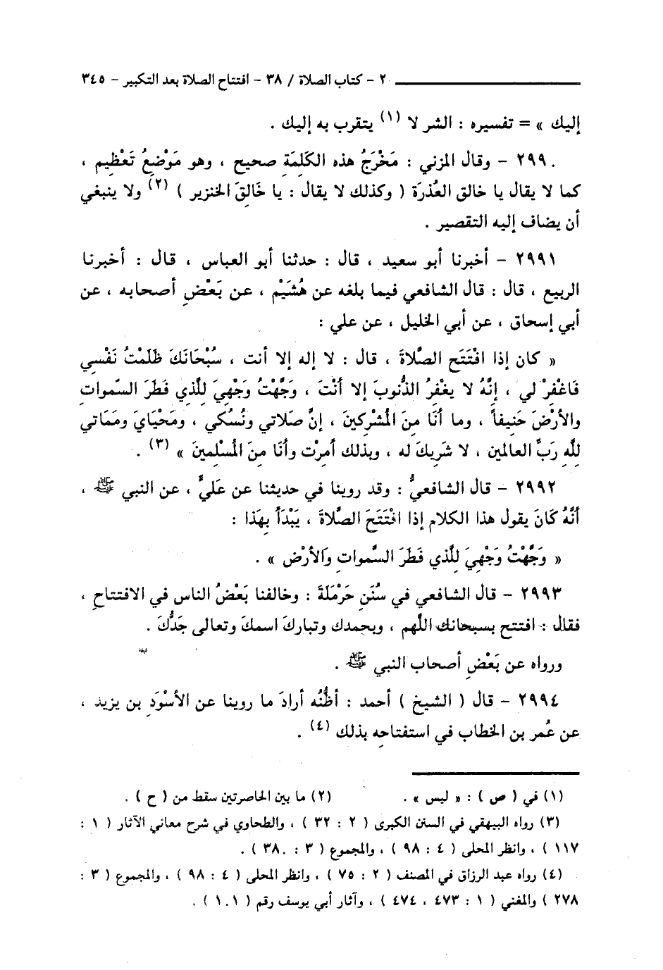 2991 - أَخْبَرَنَا أَبُو سَعِيدٍ قَالَ: حَدَّثَنَا أَبُو الْعَبَّاسِ قَالَ: أَخْبَرَنَا الرَّبِيعُ قَالَ: قَالَ الشَّافِعِيُّ، فِيمَا بَلَغَهُ عَنْ هُشَيْمٍ، عَنْ بَعْضِ، أَصْحَابِهِ، عَنْ أَبِي إِسْحَاقَ، عَنْ أَبِي الْخَلِيلِ، عَنْ عَلِيٍّ: " كَانَ إِذَا افْتَتَحَ الصَّلَاةَ قَالَ: §لَا إِلَهَ إِلَّا أَنْتَ، سُبْحَانَكَ ظَلَمْتُ نَفْسِي فَاغْفِرْ لِي إِنَّهُ لَا يَغْفِرُ الذُّنُوبَ إِلَّا أَنْتَ، وَجَّهْتُ وَجْهِيَ لِلَّذِي فَطَرَ السَّمَاوَاتِ، وَالْأَرْضَ حَنِيفًا، وَمَا أَنَا مِنَ الْمُشْرِكِينَ، إِنَّ صَلَاتِي، وَنُسُكِي، وَمَحْيَايَ، وَمَمَاتِي لِلَّهِ رَبِّ الْعَالَمِينَ، لَا شَرِيكَ لَهُ، وَبِذَلِكَ أُمِرْتُ، وَأَنَا مِنَ الْمُسْلِمِينَ "