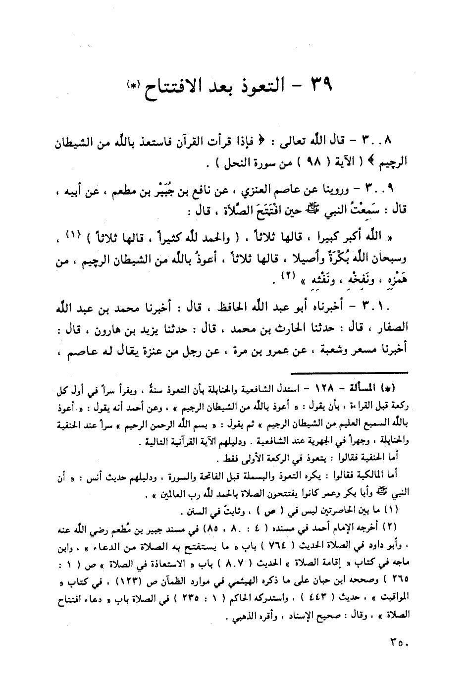 3009 - وَرَوَيْنَا عَنْ عَاصِمٍ الْعَنَزِيِّ، عَنْ نَافِعِ بْنِ جُبَيْرِ بْنِ مُطْعِمٍ، عَنْ أَبِيهِ قَالَ: سَمِعْتُ النَّبِيَّ صَلَّى اللهُ عَلَيْهِ وَسَلَّمَ، حِينَ افْتَتَحَ الصَّلَاةَ قَالَ: «§اللَّهُ أَكْبَرُ كَبِيرًا» قَالَهَا ثَلَاثًا، «وَالْحَمْدُ لِلَّهِ كَثِيرًا» قَالَهَا ثَلَاثًا، «وَسُبْحَانَ اللَّهِ بُكْرَةً وَأَصِيلًا» قَالَهَا ثَلَاثًا، «أَعُوذُ بِاللَّهِ مِنَ الشَّيْطَانِ الرَّجِيمِ، مِنْ هَمْزِهِ، وَنَفْخِهِ، وَنَفْثِهِ»