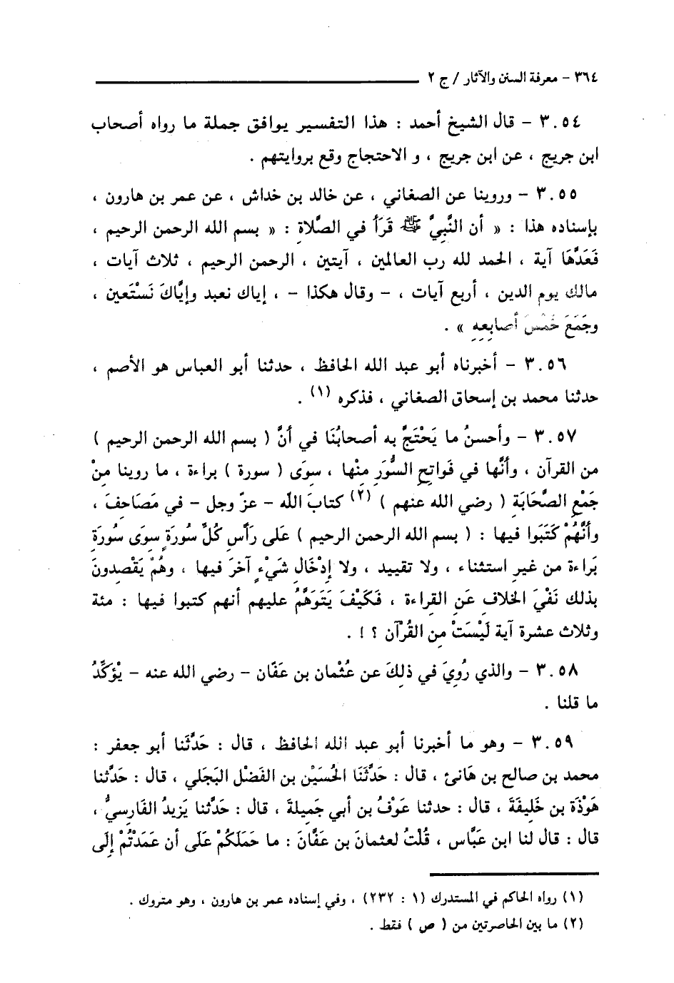 3060 - قَالَ الشَّيْخُ أَحْمَدُ: قَدْ عَلِمْنَا بِالرِّوَايَةِ الصَّحِيحَةِ، عَنِ ابْنِ عَبَّاسٍ: أَنَّهُ كَانَ يَعُدُّ {بِسْمِ اللَّهِ الرَّحْمَنِ الرَّحِيمِ} [الفاتحة: 1] آيَةً مِنَ الْفَاتِحَةِ، بَعْدَ سَمَاعِ هَذَا الْحَدِيثِ مِنْ عُثْمَانَ بْنِ عَفَّانَ