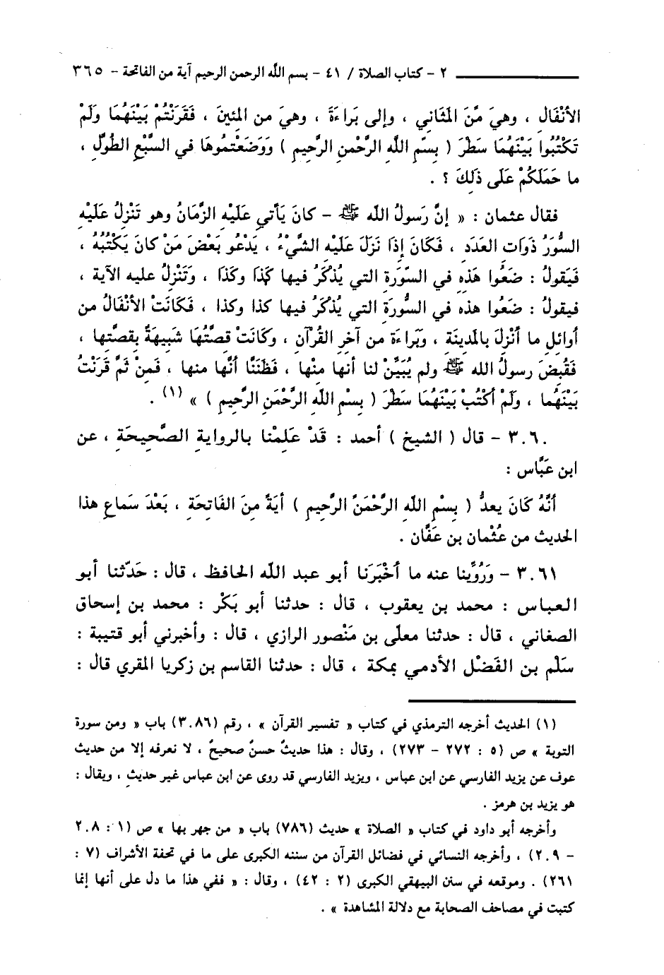 3064 - وَقَدِ احْتَجَّ الشَّافِعِيُّ بِهَذَا فِي سُنَنِ حَرْمَلَةَ، وَهَذَا الْقَوْلُ صَدَرَ مِنَ ابْنِ عَبَّاسٍ بَعْدَ سُؤَالِهِ عُثْمَانَ، وَكَذَلِكَ سَائِرُ مَا رُوِيَ عَنْهُ فِي قِرَاءَةِ: بِسْمِ اللَّهِ الرَّحْمَنِ الرَّحِيمِ، وَالْجَهْرِ بِهَا، فَكَيْفَ يُسْتَدَلُّ بِسُؤَالِهِ عُثْمَانَ عَلَى رُجُوعِهِ عَنْ هَذَا الْمَذْهَبِ الَّذِي انْتَشَرَ عَنْهُ بَعْدَهُ؟ بَلْ يُسْتَدَلُّ بِمَذْهَبِهِ عَلَى أَنَّ مُرَادَ عُثْمَانَ بِمَا قَالَ مَا ذَهَبَ إِلَيْهِ، وَهُوَ أَنَّ النَّبِيَّ صَلَّى اللهُ عَلَيْهِ وَسَلَّمَ كَانَ يُبَيِّنُ خَتْمَ السُّورَةِ وَابْتِدَاءَ غَيْرِهَا بِقِرَاءَةِ: بِسْمِ اللَّهِ الرَّحْمَنِ الرَّحِيمِ فِي أَوَّلِهَا مُخْبِرًا بِنُزُولِهَا مَعَهَا، كَمَا قَالَ فِي حَدِيثِ أَنَسِ بْنِ مَالِكٍ، نَزَلَتْ عَلَيَّ سُورَةٌ، فَقَرَأَ: بِسْمِ اللَّهِ الرَّحْمَنِ الرَّحِيمِ إِنَّا أَعْطَيْنَاكَ الْكَوْثَرَ إِلَى آخِرِهَا -[367]-.
