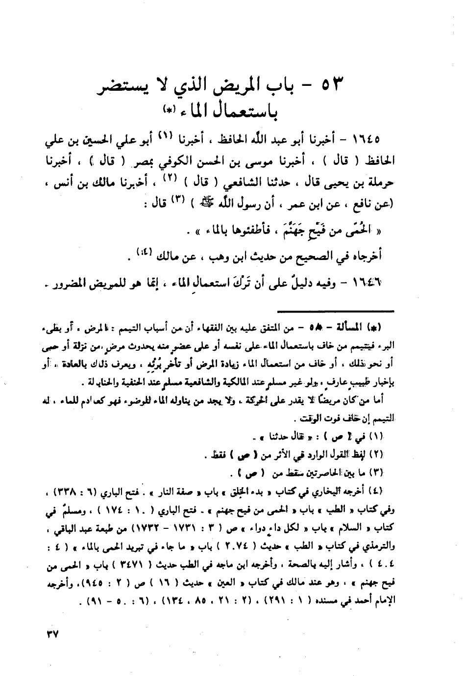 1646 - وَفِيهِ دَلِيلٌ عَلَى أَنَّ تَرَكَ اسْتِعْمَالِ الْمَاءِ، إِنَّمَا هُوَ لِلْمَرِيضِ الْمَضْرُورِ