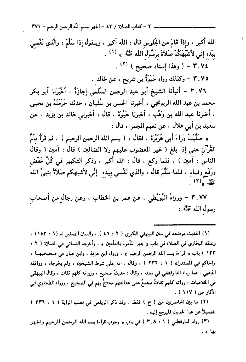 3076 - أَنْبَأَنَا الشَّيْخُ أَبُو عَبْدِ الرَّحْمَنِ السُّلَمِيُّ، إِجَازَةً، أَخْبَرَنَا أَبُو بَكْرٍ مُحَمَّدُ بْنُ عَبْدِ اللَّهِ الرِّيوَنْجِيُّ، أَخْبَرَنَا الْحَسَنُ بْنُ سُفْيَانَ، حَدَّثَنَا حَرْمَلَةُ بْنُ يَحْيَى، أَخْبَرَنَا عَبْدُ اللَّهِ بْنُ وَهْبٍ، أَخْبَرَنَا حَيْوَةُ قَالَ: أَخْبَرَنِي خَالِدُ بْنُ يَزِيدَ، عَنْ سَعِيدِ بْنِ أَبِي هِلَالٍ، عَنْ نُعَيْمٍ الْمُجْمِرِ قَالَ: " صَلَّيْتُ وَرَاءَ أَبِي هُرَيْرَةَ: فَقَالَ: §بِسْمِ اللَّهِ الرَّحْمَنِ الرَّحِيمِ، ثُمَّ قَرَأَ بِأُمِّ الْقُرْآنِ حَتَّى إِذَا بَلَغَ {غَيْرِ الْمَغْضُوبِ عَلَيْهِمْ وَلَا الضَّالِّينَ} [الفاتحة: 7] قَالَ: آمِينَ، وَقَالَ النَّاسُ: آمِينَ، فَلَمَّا رَكَعَ، قَالَ: اللَّهُ أَكْبَرُ، وَذَكَرَ التَّكْبِيرَ فِي كُلِّ خَفْضٍ وَرَفْعٍ وَقِيَامٍ، فَلَمَّا سَلَّمَ قَالَ: وَالَّذِي نَفْسِي بِيَدِهِ إِنِّي لَأَشْبَهُكُمْ صَلَاةً بِنَبِيِّ اللَّهِ صَلَّى اللهُ عَلَيْهِ وَسَلَّمَ "