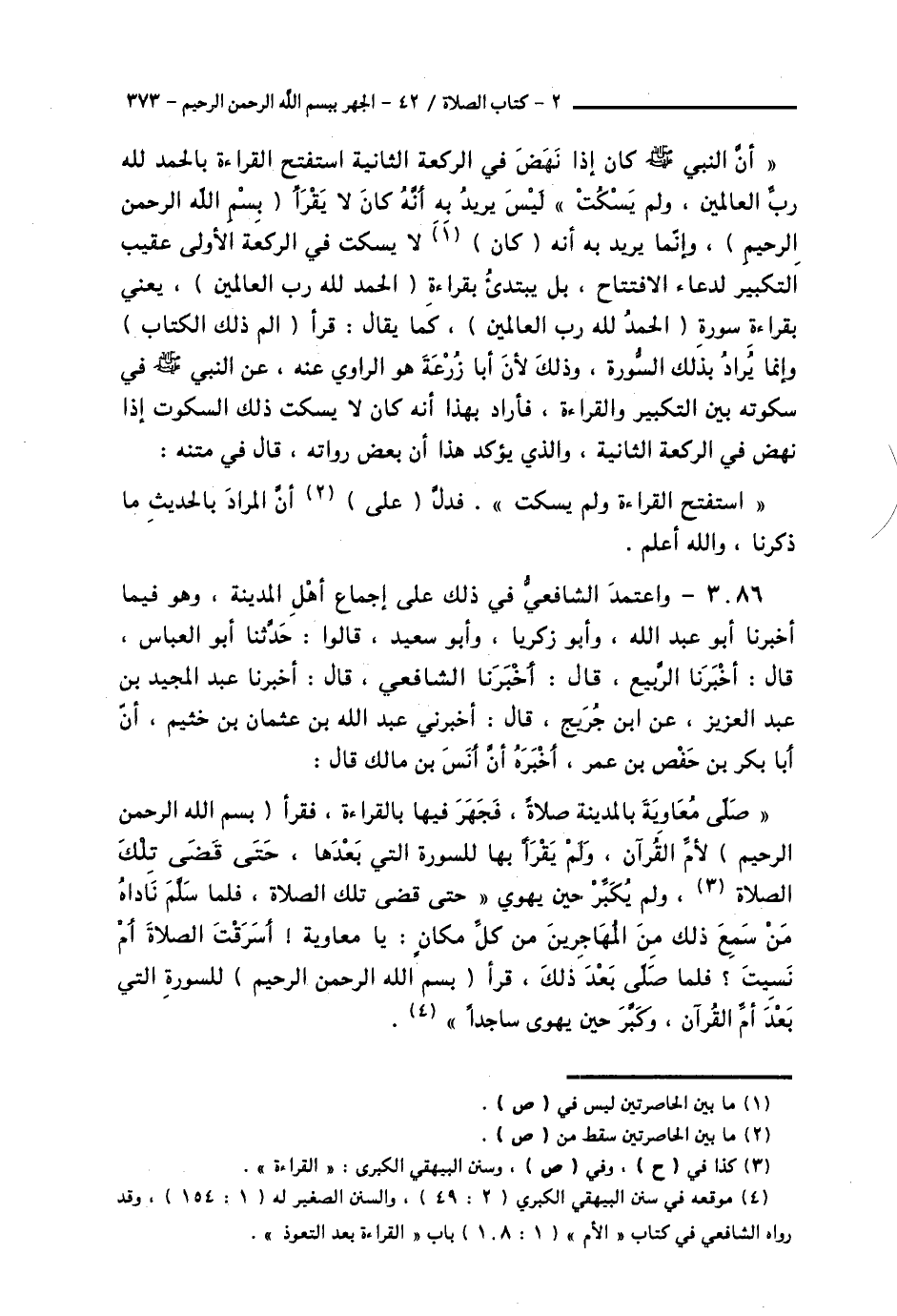 3086 - وَاعْتَمَدَ الشَّافِعِيُّ فِي ذَلِكَ عَلَى إِجْمَاعِ أَهْلِ الْمَدِينَةِ، وَهُوَ فِيمَا أَخْبَرَنَا أَبُو عَبْدِ اللَّهِ، وَأَبُو زَكَرِيَّا، وَأَبُو سَعِيدٍ، قَالُوا: حَدَّثَنَا أَبُو الْعَبَّاسِ قَالَ: أَخْبَرَنَا الرَّبِيعُ قَالَ: أَخْبَرَنَا الشَّافِعِيُّ قَالَ: أَخْبَرَنَا عَبْدُ الْمَجِيدِ بْنُ عَبْدِ الْعَزِيزِ، عَنِ ابْنِ جُرَيْجٍ قَالَ: أَخْبَرَنِي عَبْدُ اللَّهِ بْنُ عُثْمَانَ بْنِ خُثَيْمٍ، أَنَّ أَبَا بَكْرِ بْنَ حَفْصِ بْنِ عُمَرَ، أَخْبَرَهُ: أَنَّ أَنَسَ بْنَ مَالِكٍ قَالَ: " §صَلَّى مُعَاوِيَةُ، بِالْمَدِينَةِ صَلَاةً، فَجَهَرَ فِيهَا بِالْقِرَاءَةِ، فَقَرَأَ: بِسْمِ اللَّهِ الرَّحْمَنِ الرَّحِيمِ، لِأُمِّ الْقُرْآنِ، وَلَمْ يَقْرَأْ بِهَا لِلسُّورَةِ الَّتِي بَعْدَهَا، حَتَّى قَضَى تِلْكَ الصَّلَاةَ، وَلَمْ يُكَبِّرْ حِينَ يَهْوِي، حَتَّى قَضَى تِلْكَ الصَّلَاةَ، فَلَمَّا سَلَّمَ نَادَاهُ مَنْ سَمِعَ ذَلِكَ مِنَ الْمُهَاجِرِينَ مِنْ كُلِّ مَكَانٍ: يَا مُعَاوِيَةُ أَسَرَقْتَ الصَّلَاةَ أُمْ نَسِيتَ؟ فَلَمَّا صَلَّى بَعْدَ ذَلِكَ قَرَأَ: بِسْمِ اللَّهِ الرَّحْمَنِ الرَّحِيمِ، لِلسُّورَةِ الَّتِي بَعْدَ أُمِّ الْقُرْآنِ، وَكَبَّرَ حِينَ يَهْوِي سَاجِدًا "