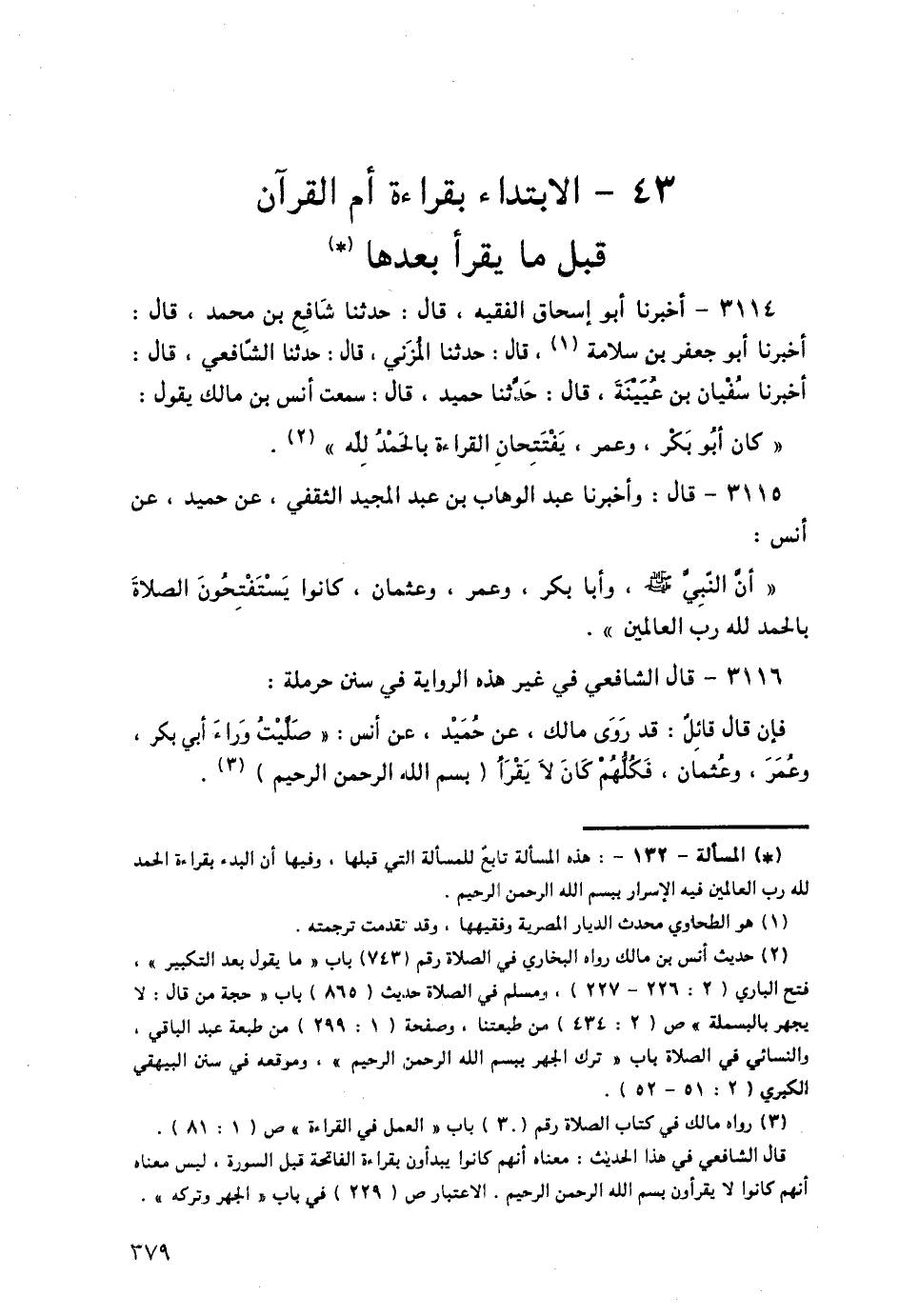 3114 - أَخْبَرَنَا أَبُو إِسْحَاقَ الْفَقِيهُ قَالَ: حَدَّثَنَا شَافِعُ بْنُ مُحَمَّدٍ قَالَ: أَخْبَرَنَا أَبُو جَعْفَرِ بْنُ سَلَامَةَ قَالَ: حَدَّثَنَا الْمُزَنِيُّ قَالَ: حَدَّثَنَا الشَّافِعِيُّ قَالَ: أَخْبَرَنَا سُفْيَانُ بْنُ عُيَيْنَةَ قَالَ: حَدَّثَنَا حُمَيْدٌ قَالَ: سَمِعْتُ أَنَسَ بْنَ مَالِكٍ، يَقُولُ: «كَانَ أَبُو بَكْرٍ، وَعُمَرَ، §يَفْتَتِحَانِ الْقِرَاءَةَ بِالْحَمْدُ لِلَّهِ»