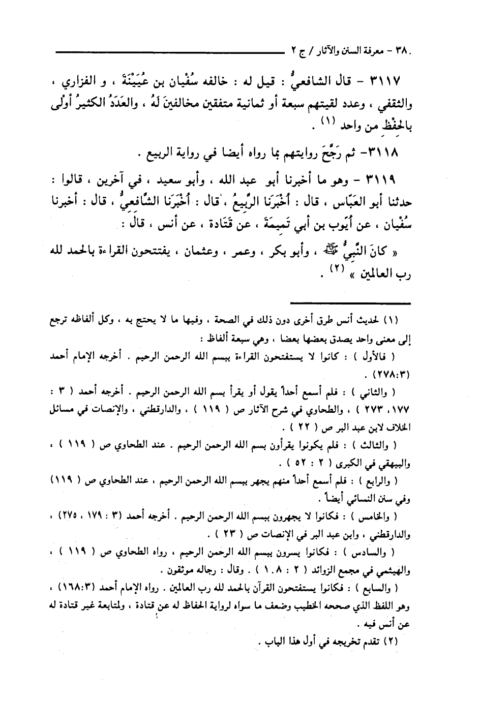 3119 - وَهُوَ مَا أَخْبَرَنَا أَبُو عَبْدِ اللَّهِ، وَأَبُو سَعِيدٍ فِي آخَرِينَ، قَالُوا: حَدَّثَنَا أَبُو الْعَبَّاسِ قَالَ: أَخْبَرَنَا الرَّبِيعُ قَالَ: أَخْبَرَنَا الشَّافِعِيُّ قَالَ: أَخْبَرَنَا سُفْيَانُ، عَنْ أَيُّوبَ بْنِ أَبِي تَمِيمَةَ، عَنْ قَتَادَةَ، عَنْ أَنَسٍ قَالَ: «كَانَ النَّبِيُّ صَلَّى اللهُ عَلَيْهِ وَسَلَّمَ، وَأَبُو بَكْرٍ، وَعُمَرَ، وَعُثْمَانَ، §يَفْتَتِحُونَ الْقِرَاءَةَ بِالْحَمْدُ لِلَّهِ رَبِّ الْعَالَمِينَ» -[381]-
