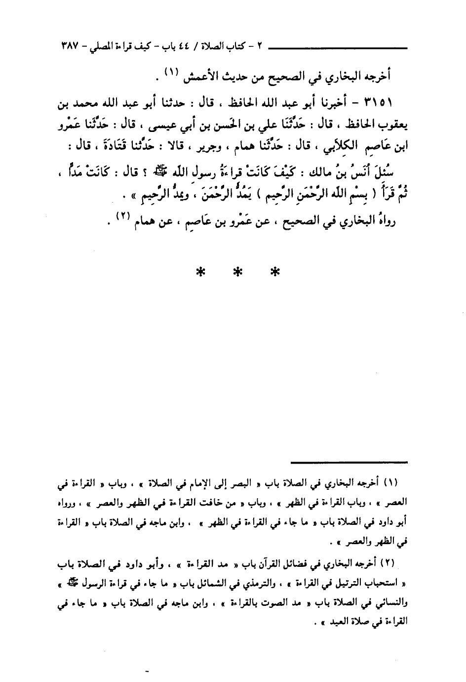 3151 - أَخْبَرَنَا أَبُو عَبْدِ اللَّهِ الْحَافِظُ قَالَ: حَدَّثَنَا أَبُو عَبْدِ اللَّهِ مُحَمَّدُ بْنُ يَعْقُوبَ الْحَافِظُ قَالَ: حَدَّثَنَا عَلِيُّ بْنُ الْحَسَنِ بْنِ أَبِي عِيسَى قَالَ: حَدَّثَنَا عَمْرُو بْنُ عَاصِمٍ الْكِلَابِيُّ قَالَ: حَدَّثَنَا هَمَّامٌ، وَجَرِيرٌ قَالَا: حَدَّثَنَا قَتَادَةُ، قَالَ: سُئِلَ أَنَسُ بْنُ مَالِكٍ: كَيْفَ كَانَتْ قِرَاءَةُ رَسُولِ اللَّهِ صَلَّى اللهُ عَلَيْهِ وَسَلَّمَ؟ قَالَ: " كَانَتْ §مَدًّا، ثُمَّ قَرَأَ: بِسْمِ اللَّهِ الرَّحْمَنِ الرَّحِيمِ، يَمُدُّ الرَّحْمَنَ، وَيَمُدُّ الرَّحِيمَ " رَوَاهُ الْبُخَارِيُّ فِي الصَّحِيحِ، عَنْ عَمْرِو بْنِ عَاصِمٍ، عَنْ هَمَّامٍ