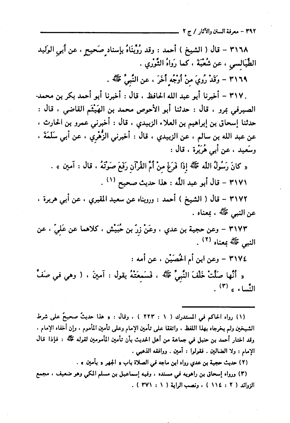 3178 - وَعَنِ ابْنِ أُمِّ الْحُصَيْنِ، عَنْ أُمِّهِ: أَنَّهَا صَلَّتْ خَلْفَ النَّبِيَّ صَلَّى اللهُ عَلَيْهِ وَسَلَّمَ، فَسَمِعَتْهُ يَقُولُ: «آمِينَ» وَهِيَ فِي صَفِّ النِّسَاءِ -[393]-.