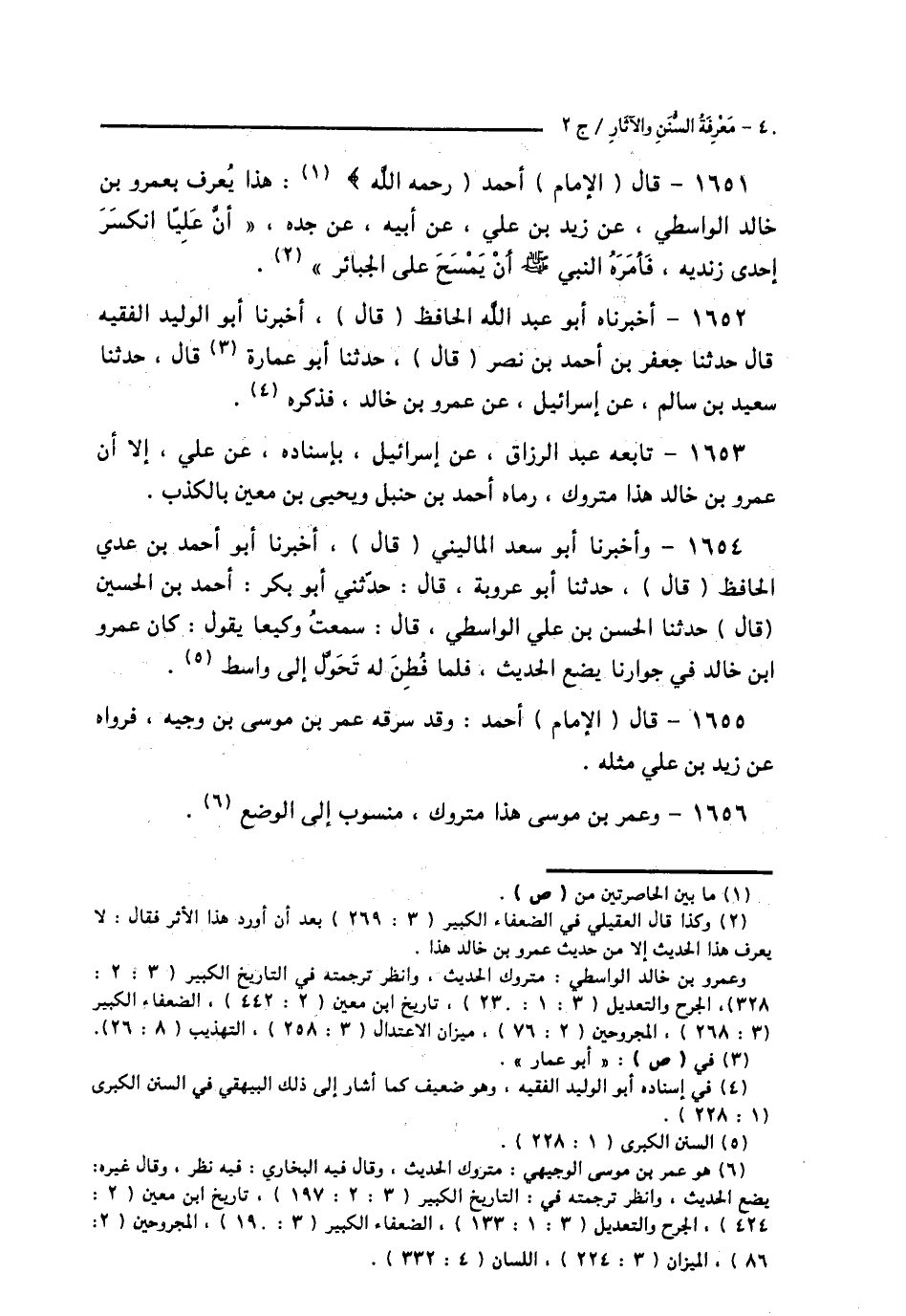 1651 - قَالَ الْإِمَامُ أَحْمَدُ، رَحِمَهُ اللَّهُ، هَذَا يُعْرَفُ بِعَمْرِو بْنِ خَالِدٍ الْوَاسِطِيِّ، عَنْ زَيْدِ بْنِ عَلِيٍّ، عَنْ أَبِيهِ، عَنْ جَدِّهِ: أَنَّ عَلِيًّا: " انْكَسَرَ إِحْدَى زَنْدَيْهِ، فَأَمَرَهُ النَّبِيُّ صَلَّى اللهُ عَلَيْهِ وَسَلَّمَ: أَنْ §يَمْسَحَ عَلَى الْجَبَائِرِ "