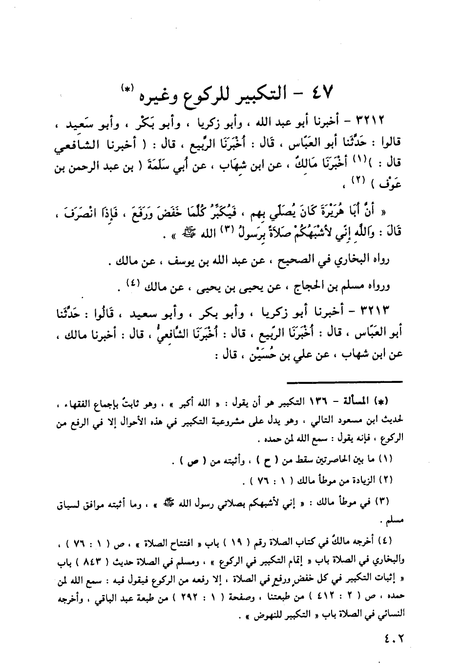 3212 - أَخْبَرَنَا أَبُو عَبْدِ اللَّهِ، وَأَبُو زَكَرِيَّا، وَأَبُو بَكْرٍ، وَأَبُو سَعِيدٍ، قَالُوا: حَدَّثَنَا أَبُو الْعَبَّاسِ قَالَ: أَخْبَرَنَا الرَّبِيعُ قَالَ: أَخْبَرَنَا الشَّافِعِيُّ قَالَ: أَخْبَرَنَا مَالِكٌ، عَنِ ابْنِ شِهَابٍ، عَنْ أَبِي سَلَمَةَ بْنِ عَبْدِ الرَّحْمَنِ بْنِ عَوْفٍ، أَنَّ أَبَا هُرَيْرَةَ: " كَانَ §يُصَلِّي بِهِمْ فَيُكَبِّرُ كُلَّمَا خَفَضَ وَرَفَعَ، فَإِذَا انْصَرَفَ قَالَ: وَاللَّهِ إِنِّي لَأَشْبَهُكُمْ صَلَاةً بِرَسُولِ اللَّهِ صَلَّى اللهُ عَلَيْهِ وَسَلَّمَ " رَوَاهُ الْبُخَارِيُّ فِي الصَّحِيحِ، عَنْ عَبْدِ اللَّهِ بْنِ يُوسُفَ، عَنْ مَالِكٍ وَرَوَاهُ مُسْلِمُ بْنُ الْحَجَّاجِ، عَنْ يَحْيَى بْنِ يَحْيَى، عَنْ مَالِكٍ
