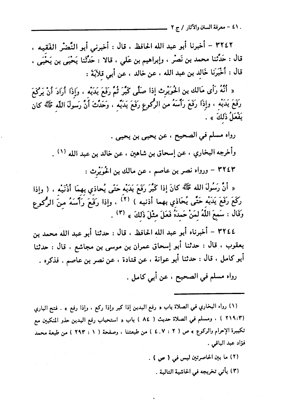 3242 - أَخْبَرَنَا أَبُو عَبْدِ اللَّهِ الْحَافِظُ قَالَ: أَخْبَرَنِي أَبُو النَّضْرِ الْفَقِيهُ قَالَ: حَدَّثَنَا مُحَمَّدُ بْنُ نَصْرٍ، وَإِبْرَاهِيمُ بْنُ عَلِيٍّ، قَالَا: حَدَّثَنَا يَحْيَى بْنُ يَحْيَى قَالَ: أَخْبَرَنَا خَالِدُ بْنُ عَبْدِ اللَّهِ، عَنْ خَالِدٍ، عَنْ أَبِي قِلَابَةَ، أَنَّهُ: «رَأَى مَالِكَ بْنَ الْحُوَيْرِثِ §إِذَا صَلَّى كَبَّرَ ثُمَّ رَفَعَ يَدَيْهِ، وَإِذَا أَرَادَ أَنْ يَرْكَعَ رَفَعَ يَدَيْهِ، وَإِذَا رَفَعَ رَأْسَهُ مِنَ الرُّكُوعِ رَفَعَ يَدَيْهِ، وَحَدَّثَ أَنَّ رَسُولَ اللَّهِ صَلَّى اللهُ عَلَيْهِ وَسَلَّمَ كَانَ يَفْعَلُ ذَلِكَ» رَوَاهُ مُسْلِمٌ فِي الصَّحِيحِ، عَنْ يَحْيَى بْنِ يَحْيَى وَأَخْرَجَهُ الْبُخَارِيُّ، عَنْ إِسْحَاقَ بْنِ شَاهِينَ، عَنْ خَالِدِ بْنِ عَبْدِ اللَّهِ