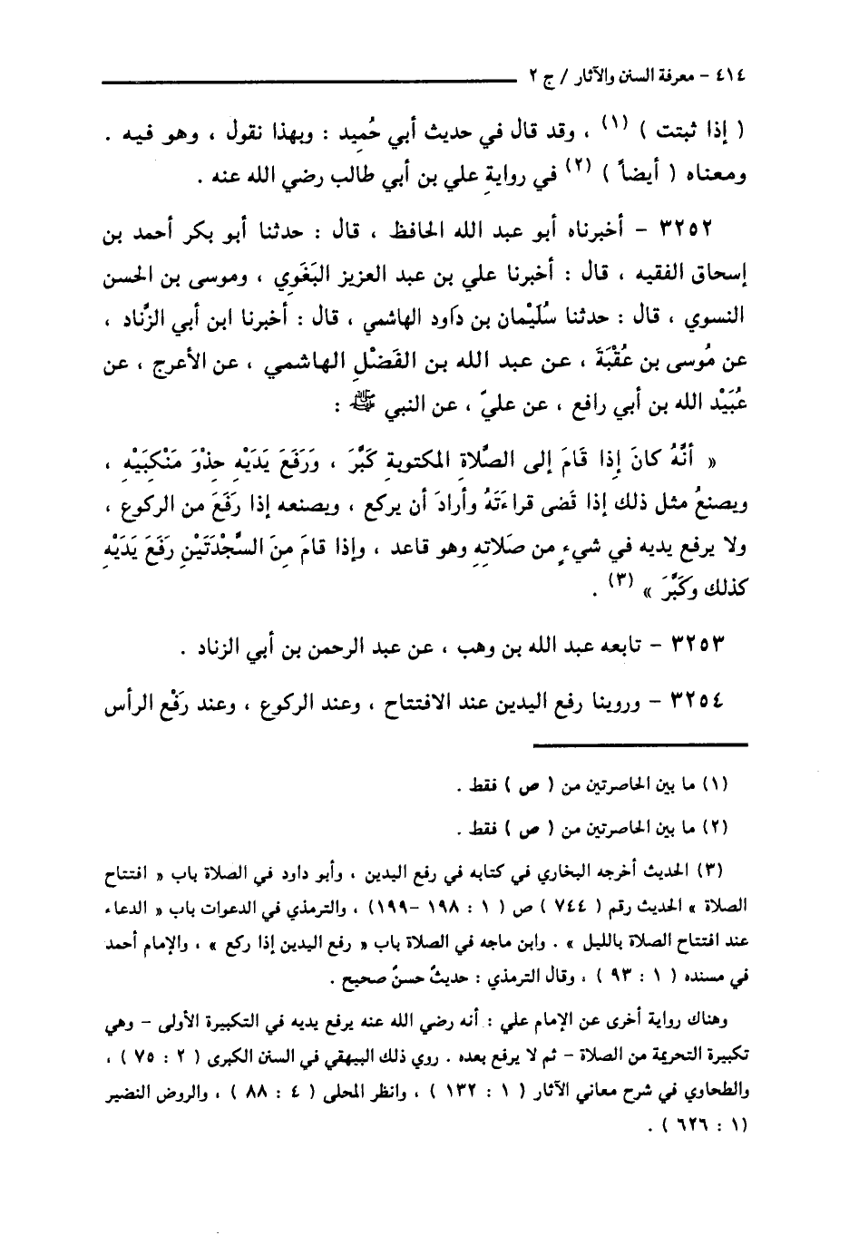 3254 - وَرُوِّينَا رَفْعَ الْيَدَيْنِ، عِنْدَ الِافْتِتَاحِ، وَعِنْدَ الرُّكُوعِ، وَعِنْدَ رَفْعِ الرَّأْسِ -[415]- مِنَ الرُّكُوعِ عَنْ أَبِي بَكْرٍ الصِّدِّيقِ، وَعُمَرَ بْنِ الْخَطَّابِ، وَأَبِي مُوسَى الْأَشْعَرِيِّ، وَجَابِرِ بْنِ عَبْدِ اللَّهِ الْأَنْصَارِيِّ، وَأَبِي هُرَيْرَةَ -[416]-، وَأَنَسِ بْنِ مَالِكٍ وَغَيْرِهِمْ، عَنِ النَّبِيِّ صَلَّى اللهُ عَلَيْهِ وَسَلَّمَ