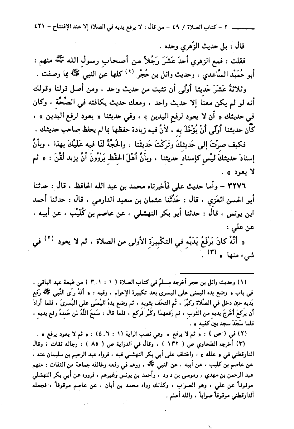 3276 - وَأَمَّا حَدِيثُ عَلِيٍّ فَأَخْبَرَنَاهُ مُحَمَّدُ بْنُ عَبْدِ اللَّهِ الْحَافِظُ قَالَ: حَدَّثَنَا أَبُو الْحَسَنِ الْعَزِيُّ قَالَ: حَدَّثَنَا عُثْمَانُ بْنُ سَعِيدٍ الدَّارِمِيُّ قَالَ: حَدَّثَنَا أَحْمَدُ بْنُ يُونُسَ قَالَ: حَدَّثَنَا أَبُو بَكْرٍ النَّهْشَلِيُّ، عَنْ عَاصِمِ بْنِ كُلَيْبٍ، عَنْ أَبِيهِ، عَنْ عَلِيٍّ، أَنَّهُ: «كَانَ §يَرْفَعُ يَدَيْهِ فِي التَّكْبِيرَةِ الْأُولَى مِنَ الصَّلَاةِ، ثُمَّ لَا يَعُودُ فِي شَيْءٍ مِنْهَا» -[422]-