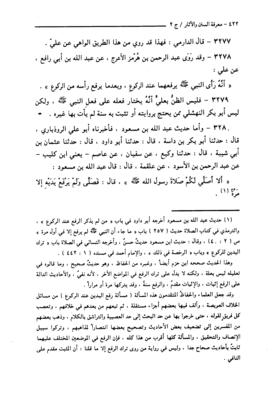 3280 - وَأَمَّا حَدِيثُ عَبْدِ اللَّهِ بْنِ مَسْعُودٍ، فَأَخْبَرَنَاهُ أَبُو عَلِيٍّ الرُّوذْبَارِيُّ قَالَ: حَدَّثَنَا أَبُو بَكْرِ بْنُ دَاسَةَ قَالَ: حَدَّثَنَا أَبُو دَاوُدَ قَالَ: حَدَّثَنَا عُثْمَانُ بْنُ أَبِي شَيْبَةَ قَالَ: حَدَّثَنَا وَكِيعٌ، عَنْ سُفْيَانَ، عَنْ عَاصِمٍ يَعْنِي ابْنَ كُلَيْبٍ، عَنْ عَبْدِ الرَّحْمَنِ بْنِ الْأَسْوَدِ، عَنْ عَلْقَمَةَ قَالَ: قَالَ عَبْدُ اللَّهِ بْنُ مَسْعُودٍ: أَلَا أُصَلِّي لَكُمْ صَلَاةَ رَسُولِ اللَّهِ صَلَّى اللهُ عَلَيْهِ وَسَلَّمَ، قَالَ: § «فَصَلَّى وَلَمْ يَرْفَعْ يَدَيْهِ إِلَّا مَرَّةً» -[423]-