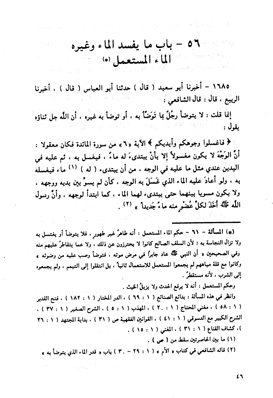 1685 - أَخْبَرَنَا أَبُو سَعِيدٍ قَالَ: حَدَّثَنَا أَبُو الْعَبَّاسِ قَالَ: أَخْبَرَنَا الرَّبِيعُ قَالَ: قَالَ الشَّافِعِيُّ: إِنَّمَا قُلْتُ: §لَا يَتَوَضَّأُ رَجُلٌ بِمَا تَوَضَّأَ بِهِ، أَوْ تَوَضَّأَ بِهِ غَيْرُهُ، أَنَّ اللَّهَ جَلَّ ثَنَاؤُهُ يَقُولُ: {فَاغْسِلُوا وُجُوهَكُمْ وَأَيْدِيَكُمْ} [المائدة: 6] مِنْ سُورَةِ الْمَائِدَةِ فَكَانَ مَعْقُولًا: أَنَّ الْوَجْهَ لَا يَكُونُ مَغْسُولًا إِلَّا بِأَنْ يَبْتَدِئَ لَهُ مَاءً فَيُغْسَلَ بِهِ، ثُمَّ عَلَيْهِ فِي الْيَدَيْنِ عِنْدِي مِثْلَ مَا عَلَيْهِ فِي الْوَجْهِ، مِنْ أَنْ يَبْتَدِئَ لَهُ مَاءً فَيَغْسِلَهُ بِهِ، وَلَوْ أَعَادَ عَلَيْهِ الْمَاءَ الَّذِي غَسَلَ بِهِ الْوَجْهَ، كَأَنْ لَمْ يُسَوِّ بَيْنَ يَدَيْهِ وَوَجْهِهِ، وَلَا يَكُونُ مُسَوِّيًا بَيْنَهُمَا حَتَّى يَبْتَدِئَ لَهُمَا الْمَاءَ، كَمَا ابْتَدَأَ لِوَجْهِهِ، وَأَنَّ رَسُولَ اللَّهِ صَلَّى اللهُ عَلَيْهِ وَسَلَّمَ: «أَخَذَ لِكُلِّ عُضْو مِنْهُ مَاءً جَدِيدًا»