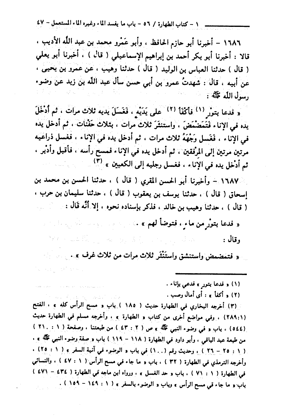 1686 - أَخْبَرَنَا أَبُو حَازِمٍ الْحَافِظُ، وَأَبُو عَمْرٍو مُحَمَّدُ بْنُ عَبْدِ اللَّهِ الْأَدِيبُ قَالَا: أَخْبَرَنَا أَبُو بَكْرٍ أَحْمَدُ بْنُ إِبْرَاهِيمَ الْإِسْمَاعِيلِيُّ قَالَ: أَخْبَرَنَا أَبُو يَعْلَى قَالَ: حَدَّثَنَا الْعَبَّاسُ بْنُ الْوَلِيدِ قَالَ: حَدَّثَنَا وُهَيْبٌ، عَنْ عَمْرِو بْنِ يَحْيَى، عَنْ أَبِيهِ قَالَ: شَهِدْتُ عَمْرَو بْنَ أَبِي حَسَنٍ سَأَلَ عَبْدَ اللَّهِ بْنَ زَيْدٍ، عَنْ وُضُوءِ رَسُولِ اللَّهِ صَلَّى اللهُ عَلَيْهِ وَسَلَّمَ: «§فَدَعَا بِتَوْرٍ فَأَكْفَأَ عَلَى يَدَيْهِ، فَغَسَلَ يَدَيْهِ ثَلَاثَ مَرَّاتٍ، ثُمَّ أَدْخَلَ يَدَهُ فِي الْإِنَاءِ فَتَمَضْمَضَ، وَاسْتَنْثَرَ ثَلَاثَ مَرَّاتٍ، بِثَلَاثِ حَفْنَاتٍ، ثُمَّ أَدْخَلَ يَدَهُ فِي الْإِنَاءِ، فَغَسَلَ وَجْهَهُ ثَلَاثَ مَرَّاتٍ، ثُمَّ أَدْخَلَ يَدَهُ فِي الْإِنَاءِ، فَغَسَلَ ذِرَاعَيْهِ مَرَّتَيْنِ مَرَّتَيْنِ إِلَى الْمِرْفَقَيْنِ، ثُمَّ أَدْخَلَ يَدَهُ فِي الْإِنَاءِ فَمَسَحَ رَأْسَهُ، فَأَقْبَلَ، وَأَدْبَرَ، ثُمَّ أَدْخَلَ يَدَهُ فِي الْإِنَاءِ، فَغَسَلَ رِجْلَيْهِ إِلَى الْكَعْبَيْنِ»