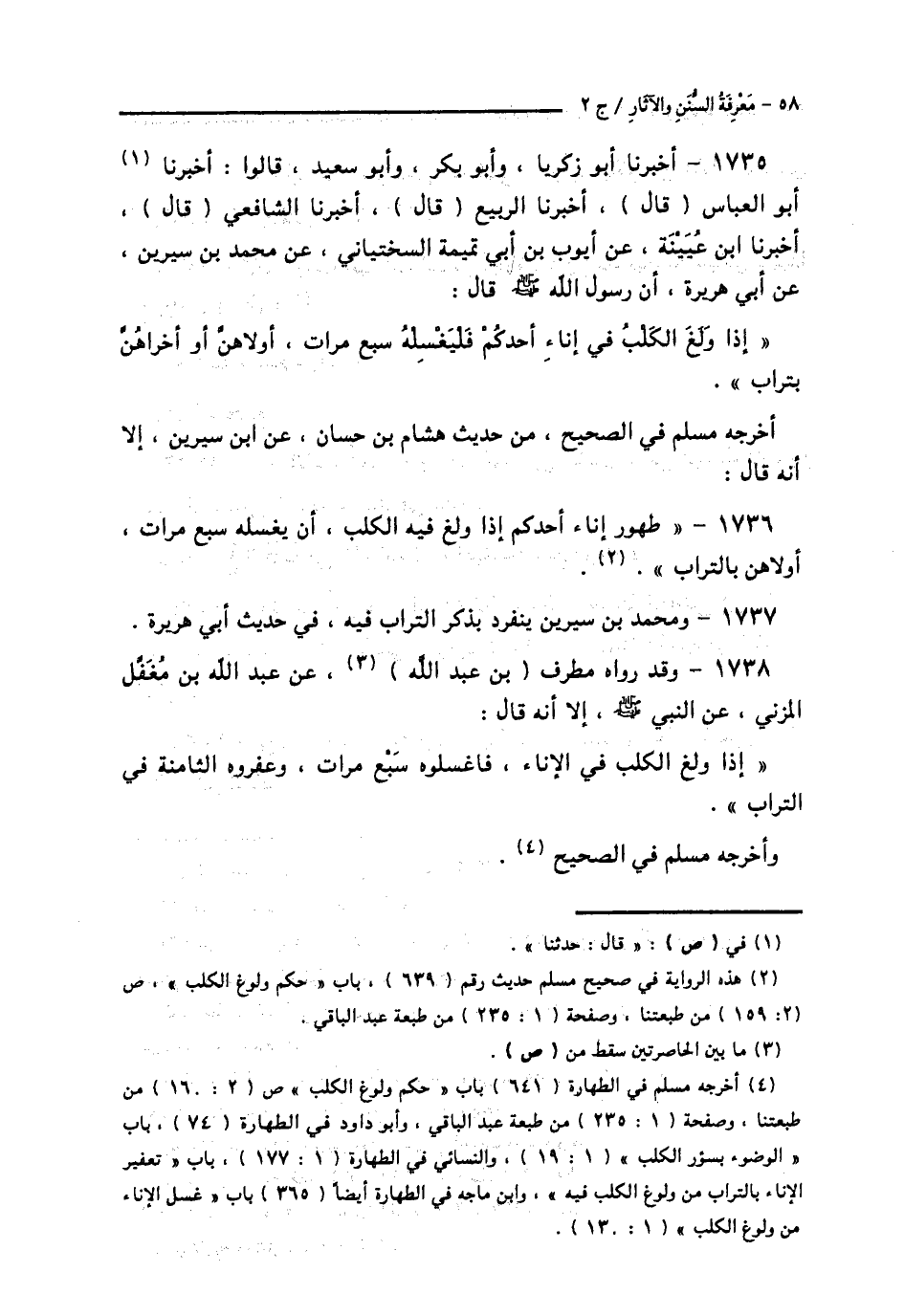 1736 - طَهُورُ إِنَاءِ أَحَدِكُمْ إِذَا وَلَغَ فِيهِ الْكَلْبُ، أَنْ يَغْسِلَهُ سَبْعَ مَرَّاتٍ، أُولَاهُنَّ بِالتُّرَابِ»
