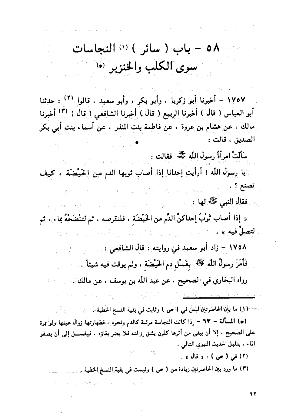1758 - زَادَ أَبُو سَعِيدٍ فِي رِوَايَتِهِ: قَالَ الشَّافِعِيُّ: فَأَمَرَ رَسُولُ اللَّهِ صَلَّى اللهُ عَلَيْهِ وَسَلَّمَ: بِغَسْلِ دَمِ الْحَيْضَةِ، وَلَمْ يُوَقِّتْ فِيهِ شَيْئًا، رَوَاهُ الْبُخَارِيُّ فِي الصَّحِيحِ، عَنْ عَبْدِ اللَّهِ بْنِ يُوسُفَ، عَنْ مَالِكٍ -[63]-، وَأَخْرَجَهُ مُسْلِمٌ مِنْ وَجْهٍ آخَرَ، عَنْ مَالِكٍ.