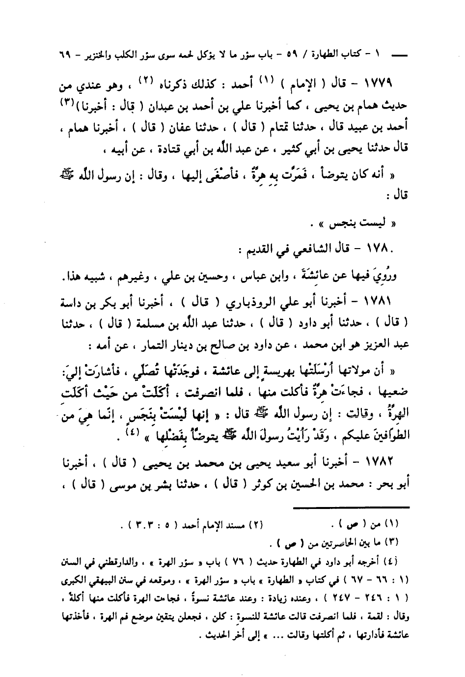 1779 - قَالَ الْإِمَامُ أَحْمَدُ: كَذَلِكَ ذَكَرْنَاهُ، وَهُوَ عِنْدِي مِنْ حَدِيثِ هَمَّامِ بْنِ يَحْيَى، كَمَا أَخْبَرَنَا عَلِيُّ بْنُ أَحْمَدَ بْنِ عَبْدَانَ قَالَ: أَخْبَرَنَا أَحْمَدُ بْنُ عُبَيْدٍ قَالَ: حَدَّثَنَا تَمْتَامٌ قَالَ: حَدَّثَنَا عَفَّانُ قَالَ: أَخْبَرَنَا هَمَّامٌ، قَالَ: حَدَّثَنَا يَحْيَى بْنُ أَبِي كَثِيرٍ، عَنْ عَبْدِ اللَّهِ بْنِ أَبِي قَتَادَةَ، عَنْ أَبِيهِ: أَنَّهُ كَانَ يَتَوَضَّأُ، فَمَرَّتْ بِهِ هِرَّةٌ فَأَصْغَى إِلَيْهَا، وَقَالَ: إِنَّ رَسُولَ اللَّهِ صَلَّى اللهُ عَلَيْهِ وَسَلَّمَ قَالَ: «§لَيْسَتْ بِنَجَسٍ»