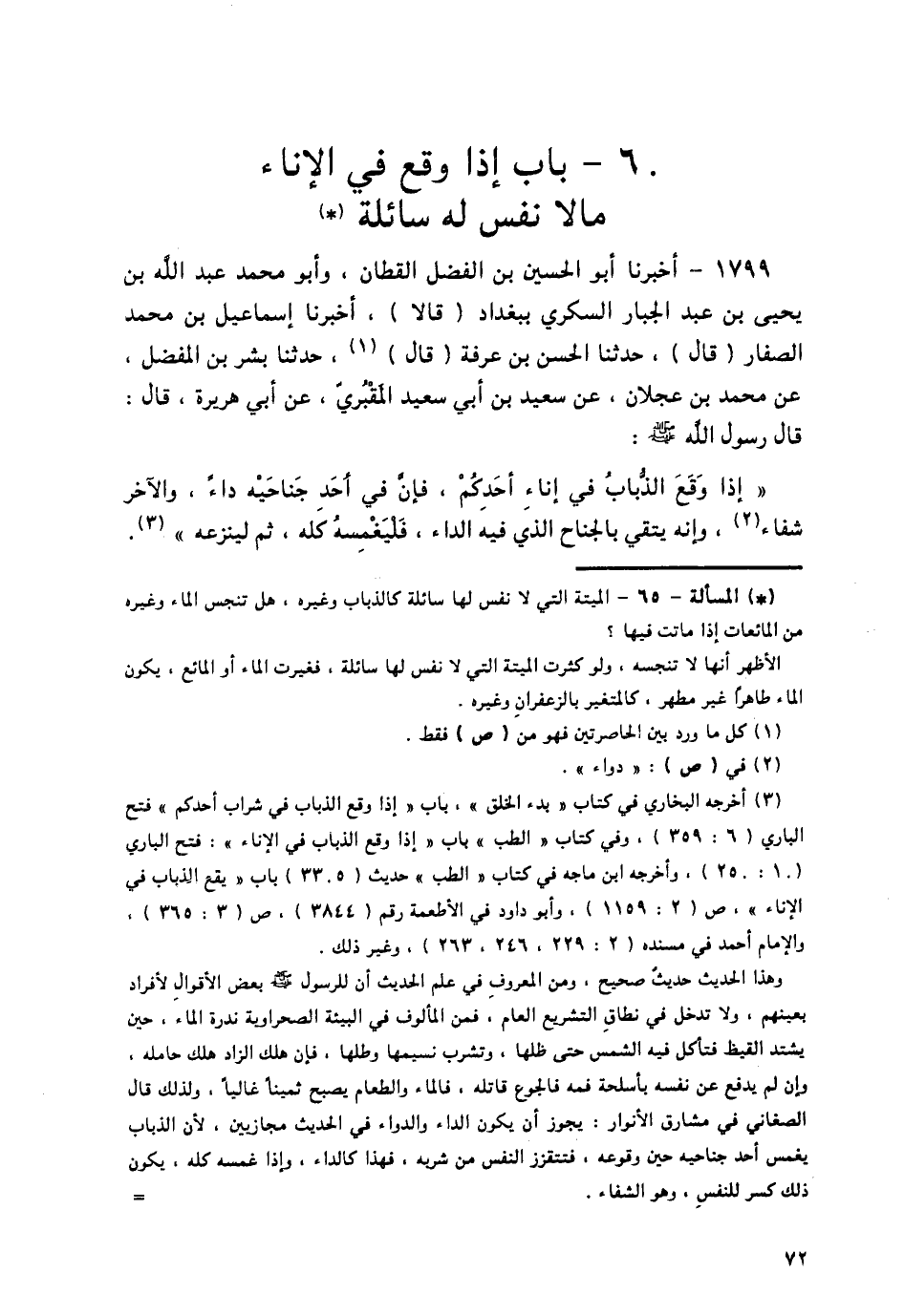 1799 - أَخْبَرَنَا أَبُو الْحُسَيْنِ بْنُ الْفَضْلِ الْقَطَّانُ، وَأَبُو مُحَمَّدٍ عَبْدُ اللَّهِ بْنُ يَحْيَى بْنِ عَبْدِ الْجَبَّارِ السُّكَّرِيُّ بِبَغْدَادَ قَالَا: أَخْبَرَنَا إِسْمَاعِيلُ بْنُ مُحَمَّدٍ الصَّفَّارُ قَالَ: حَدَّثَنَا الْحَسَنُ بْنُ عَرَفَةَ قَالَ: حَدَّثَنَا بِشْرُ بْنُ الْمُفَضَّلِ، عَنْ مُحَمَّدِ بْنِ عَجْلَانَ، عَنْ سَعِيدِ بْنِ أَبِي سَعِيدٍ الْمَقْبُرِيِّ، عَنْ أَبِي هُرَيْرَةَ قَالَ: قَالَ رَسُولُ اللَّهِ صَلَّى اللهُ عَلَيْهِ وَسَلَّمَ: «§إِذَا وَقَعَ الذُّبَابُ فِي إِنَاءِ أَحَدِكُمْ، فَإِنَّ فِي أَحَدِ جَنَاحَيْهِ دَاءً، وَالْآخَرِ شِفَاءً، وَإِنَّهُ يُتَّقَى بِالْجَنَاحِ الَّذِي فِيهِ الدَّاءُ، فَلْيَغْمِسْهُ كُلَّهُ، ثُمَّ لِيَنْزِعْهُ» -[73]-