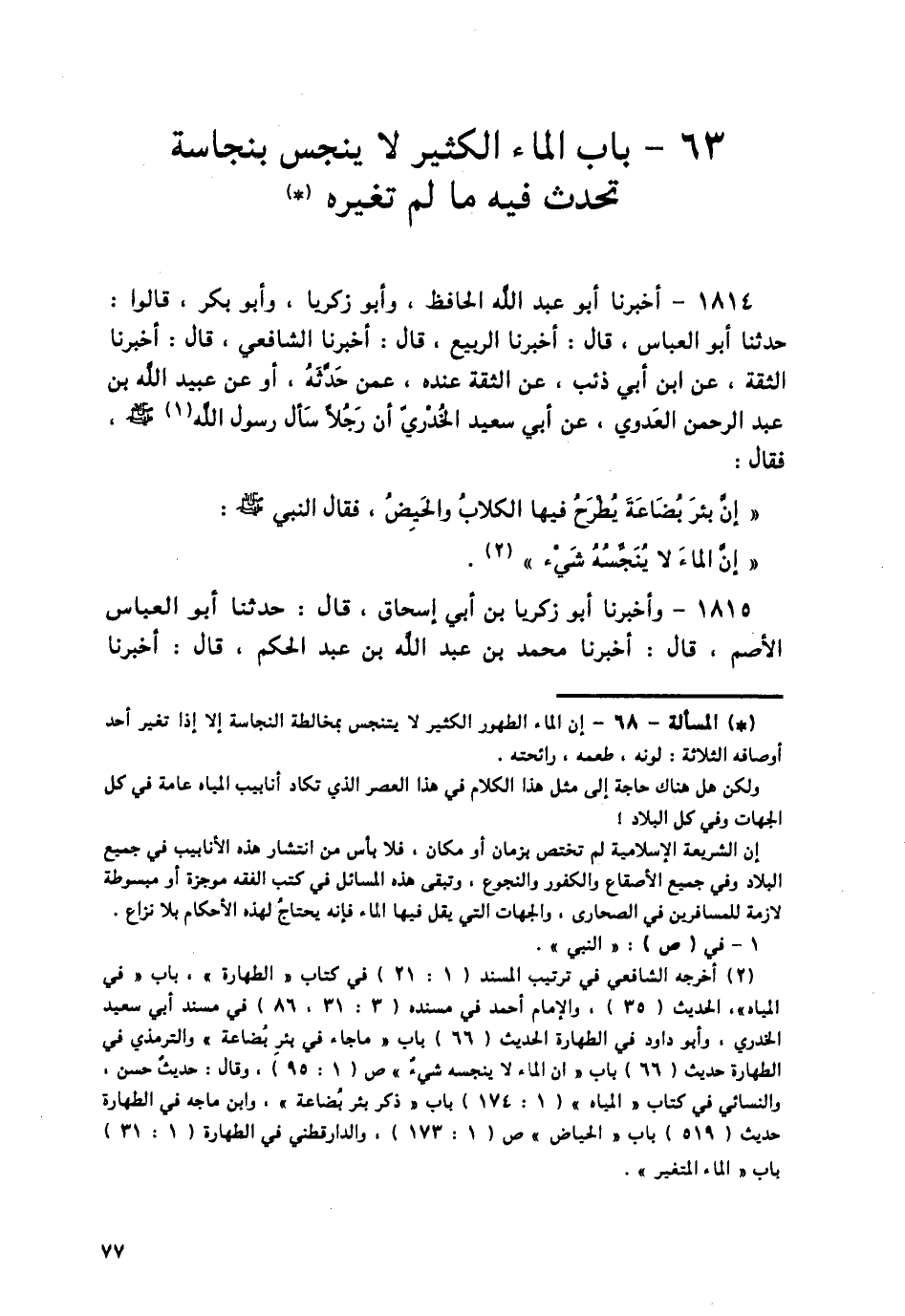 1815 - وَأَخْبَرَنَا أَبُو زَكَرِيَّا بْنُ أَبِي إِسْحَاقَ قَالَ: حَدَّثَنَا أَبُو الْعَبَّاسِ الْأَصَمُّ قَالَ: أَخْبَرَنَا مُحَمَّدُ بْنُ عَبْدِ اللَّهِ بْنِ عَبْدِ الْحَكَمِ قَالَ: أَخْبَرَنَا -[78]- ابْنُ وَهْبٍ، عَنِ ابْنِ أَبِي ذِئْبٍ، عَمَّنْ لَا يُتَّهَمُ، عَنْ عُبَيْدِ اللَّهِ بْنِ عَبْدِ الرَّحْمَنِ الْعَدَوِيِّ، عَنْ أَبِي سَعِيدٍ الْخُدْرِيِّ، أَنَّهُ قَالَ: قِيلَ لِرَسُولِ اللَّهِ صَلَّى اللهُ عَلَيْهِ وَسَلَّمَ، إِنَّكَ تَتَوَضَّأُ مِنْ بِئْرِ بُضَاعَةَ، وَهِيَ تُطْرَحُ فِيهَا مَا يُنَجِي النَّاسَ، وَلُحُومُ الْكِلَابِ، وَالْمَحِيضُ، فَقَالَ رَسُولُ اللَّهِ صَلَّى اللهُ عَلَيْهِ وَسَلَّمَ: § «إِنَّ الْمَاءَ لَا يُنَجِّسُهُ شَيْءٌ»