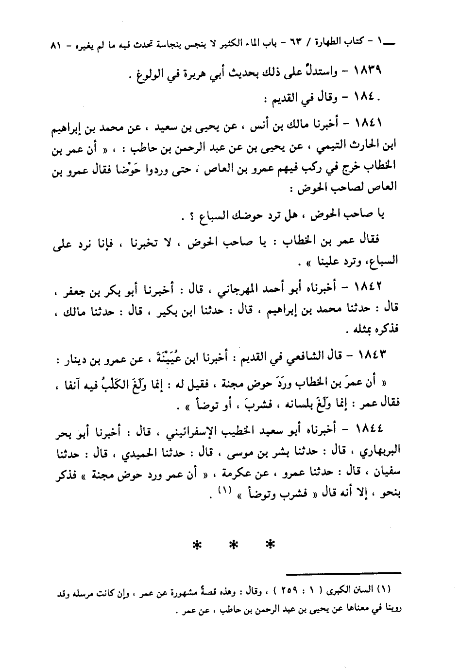 1841 - أَخْبَرَنَا مَالِكُ بْنُ أَنَسٍ، عَنْ يَحْيَى بْنِ سَعِيدٍ، عَنْ مُحَمَّدِ بْنِ إِبْرَاهِيمَ بْنِ الْحَارِثِ التَّيْمِيِّ، عَنْ يَحْيَى بْنِ مُحَمَّدٍ، عَنْ عَبْدِ الرَّحْمَنِ بْنِ حَاطِبٍ: أَنَّ عُمَرَ بْنَ الْخَطَّابِ، خَرَجَ فِي رَكْبٍ فِيهِمْ عَمْرُو بْنُ الْعَاصِ، حَتَّى وَرَدُوا حَوْضًا فَقَالَ عَمْرُو بْنُ الْعَاصِ لِصَاحِبِ الْحَوْضِ: يَا صَاحِبَ الْحَوْضِ، هَلْ تَرِدُ حَوْضَكَ السِّبَاعُ؟ فَقَالَ عُمَرُ بْنُ الْخَطَّابِ: «§يَا صَاحِبَ الْحَوْضِ، لَا تُخْبِرْنَا، فَإِنَّا نَرِدُ عَلَى السِّبَاعِ، وَتَرِدُ عَلَيْنَا»
