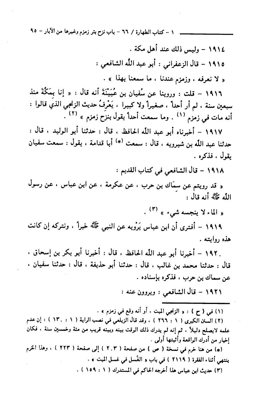 1916 - قُلْتُ: وَرَوَيْنَا عَنْ سُفْيَانَ بْنِ عُيَيْنَةَ أَنَّهُ قَالَ: §إِنَّا بِمَكَّةَ مُنْذُ سَبْعِينَ سَنَةً , لَمْ أَرَ أَحَدًا , صَغِيرًا وَلَا كَبِيرًا , يَعْرِفُ حَدِيثَ الزَّنْجِيِّ، الَّذِي قَالُوا أَنَّهُ: مَاتَ فِي زَمْزَمَ , وَمَا سَمِعْتُ أَحَدًا يَقُولُ: بِنَزْحِ زَمْزَمَ