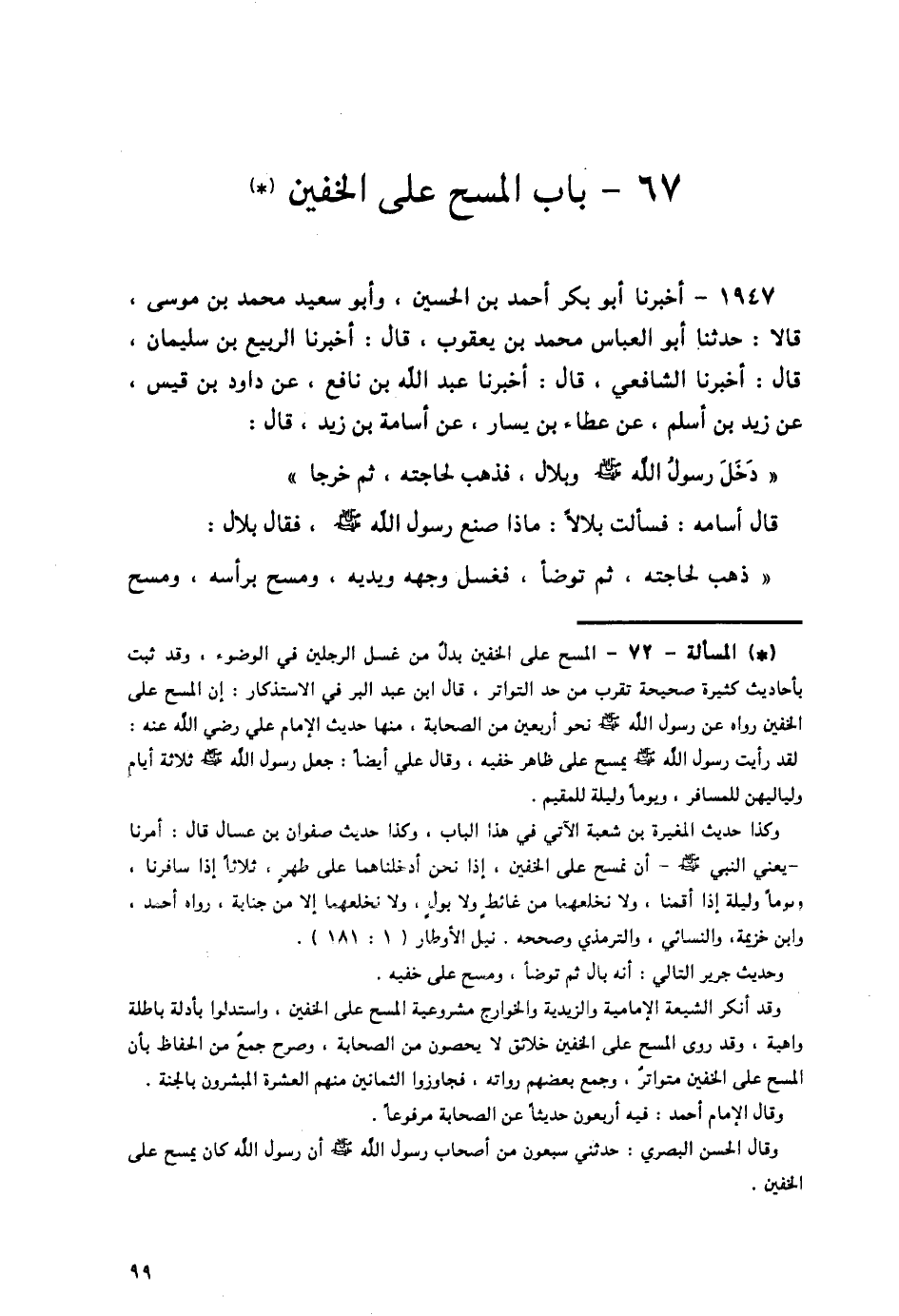 1947 - أَخْبَرَنَا أَبُو بَكْرٍ أَحْمَدُ بْنُ الْحُسَيْنِ , وَأَبُو سَعِيدٍ مُحَمَّدُ بْنُ مُوسَى قَالَا: حَدَّثَنَا أَبُو الْعَبَّاسِ مُحَمَّدُ بْنُ يَعْقُوبَ , قَالَ: أَخْبَرَنَا الرَّبِيعُ بْنُ سُلَيْمَانَ قَالَ: أَخْبَرَنَا الشَّافِعِيُّ قَالَ: أَخْبَرَنَا عَبْدُ اللَّهِ بْنُ نَافِعٍ، عَنْ دَاوُدَ بْنِ قَيْسٍ، عَنْ زَيْدِ بْنِ أَسْلَمَ، عَنْ عَطَاءِ بْنِ يَسَارٍ، عَنْ أُسَامَةَ بْنِ زَيْدٍ قَالَ: دَخَلَ رَسُولُ اللَّهِ صَلَّى اللهُ عَلَيْهِ وَسَلَّمَ، وَبِلَالٌ , فَذَهَبَ لِحَاجَتِهِ , ثُمَّ خَرَجَ قَالَ أُسَامَةُ: فَسَأَلْتُ بِلَالًا: مَاذَا صَنَعَ رَسُولُ اللَّهِ صَلَّى اللهُ عَلَيْهِ وَسَلَّمَ , فَقَالَ بِلَالٌ: «§ذَهَبَ لِحَاجَتِهِ، ثُمَّ تَوَضَّأَ , فَغَسَلَ وَجْهَهُ وَيَدَيْهِ، وَمَسَحَ بِرَأْسِهِ , وَمَسَحَ -[100]- عَلَى الْخُفَّيْنِ»
