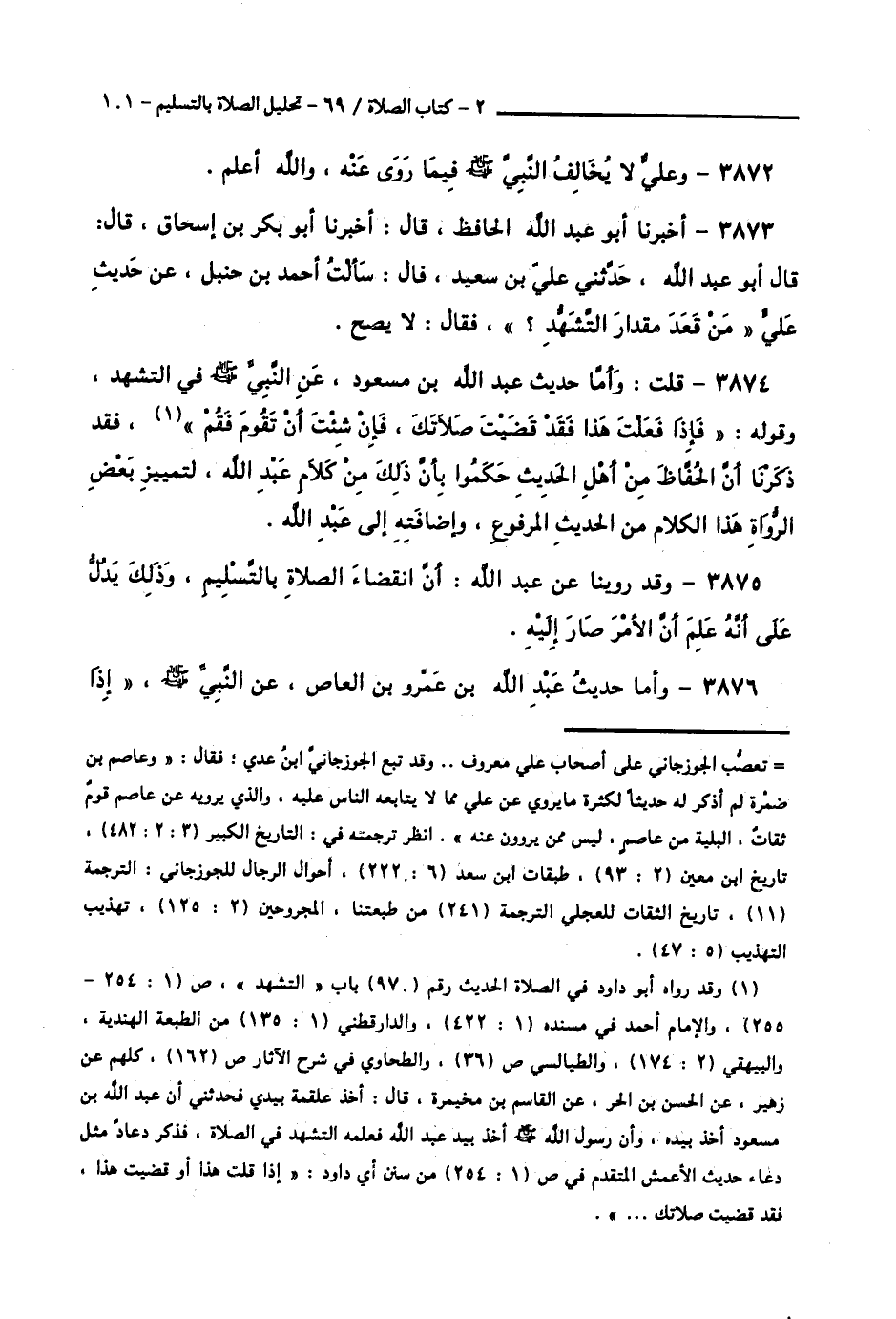 3873 - أَخْبَرَنَا أَبُو عَبْدِ اللَّهِ الْحَافِظُ قَالَ: أَخْبَرَنَا أَبُو بَكْرِ بْنُ إِسْحَاقَ قَالَ: قَالَ أَبُو عَبْدِ اللَّهِ، حَدَّثَنِي عَلِيُّ بْنُ سَعِيدٍ قَالَ: سَأَلْتُ أَحْمَدَ بْنَ حَنْبَلٍ، عَنْ حَدِيثِ عَلِيٍّ: «§مَنْ قَعَدَ مِقْدَارَ التَّشَهُّدِ؟» فَقَالَ: «لَا يَصِحُّ»