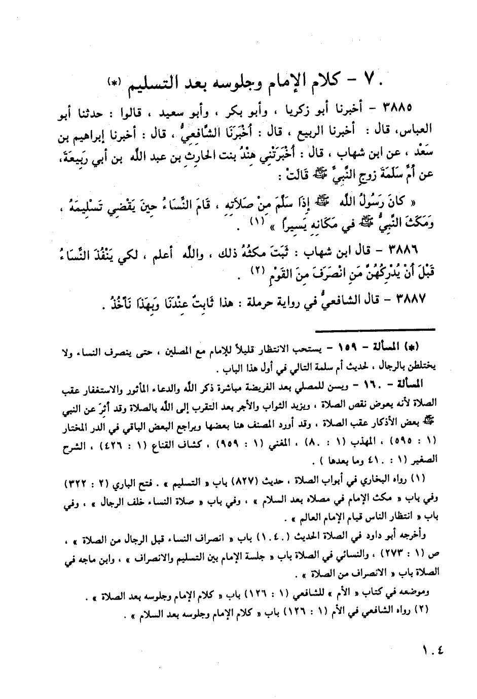 3885 - أَخْبَرَنَا أَبُو زَكَرِيَّا، وَأَبُو بَكْرٍ، وَأَبُو سَعِيدٍ، قَالُوا: حَدَّثَنَا أَبُو الْعَبَّاسِ قَالَ: أَخْبَرَنَا الرَّبِيعُ قَالَ: أَخْبَرَنَا الشَّافِعِيُّ قَالَ: أَخْبَرَنَا إِبْرَاهِيمُ بْنُ سَعْدٍ، عَنِ ابْنِ شِهَابٍ قَالَ: أَخْبَرَتْنِي هِنْدُ بِنْتُ الْحَارِثِ بْنِ عَبْدِ اللَّهِ بْنِ أَبِي رَبِيعَةَ، عَنْ أُمِّ سَلَمَةَ، زَوْجِ النَّبِيِّ صَلَّى اللهُ عَلَيْهِ وَسَلَّمَ قَالَتْ: «كَانَ رَسُولُ اللَّهِ صَلَّى اللهُ عَلَيْهِ وَسَلَّمَ، §إِذَا سَلَّمَ مَنْ صَلَاتِهِ، قَامَ النِّسَاءُ حِينَ يَقْضِي تَسْلِيمَهُ، وَمَكَثَ النَّبِيُّ صَلَّى اللهُ عَلَيْهِ وَسَلَّمَ فِي مَكَانِهِ يَسِيرًا»
