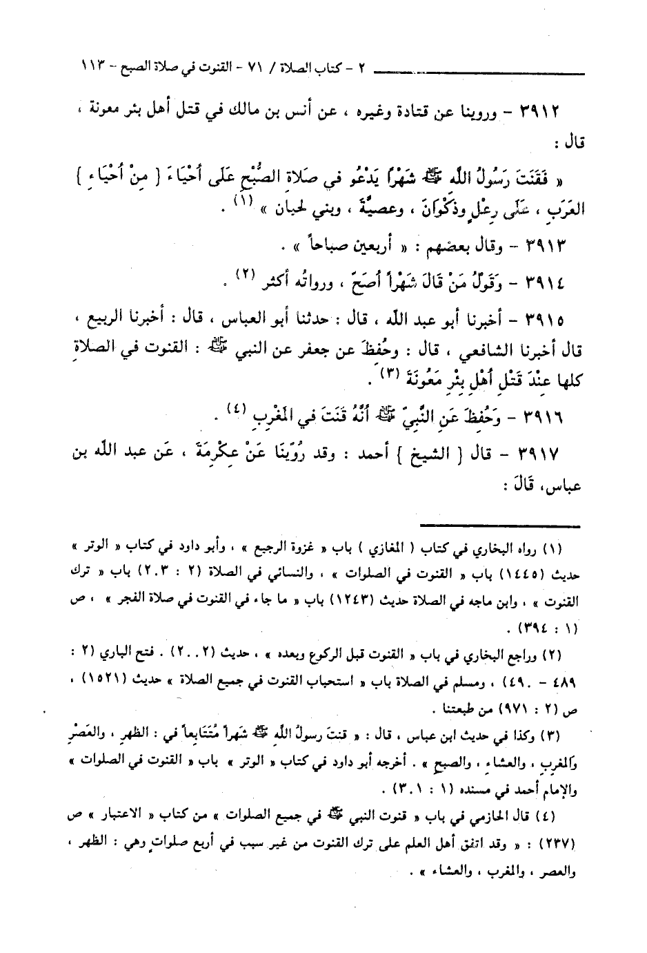 3912 - وَرُوِّينَا عَنْ قَتَادَةَ، وَغَيْرِهِ عَنْ أَنَسِ بْنِ مَالِكٍ فِي قَتْلِ أَهْلِ بِئْرِ مَعُونَةَ قَالَ: «§فَقَنَتَ رَسُولُ اللَّهِ صَلَّى اللهُ عَلَيْهِ وَسَلَّمَ، شَهْرًا يَدْعُو فِي صَلَاةِ الصُّبْحِ، عَلَى أَحْيَاءٍ مَنْ أَحْيَاءِ الْعَرَبِ، عَلَى رِعْلٍ، وَذَكْوَانَ، وَعُصَيَّةَ، وَبَنِي لِحْيَانَ»،