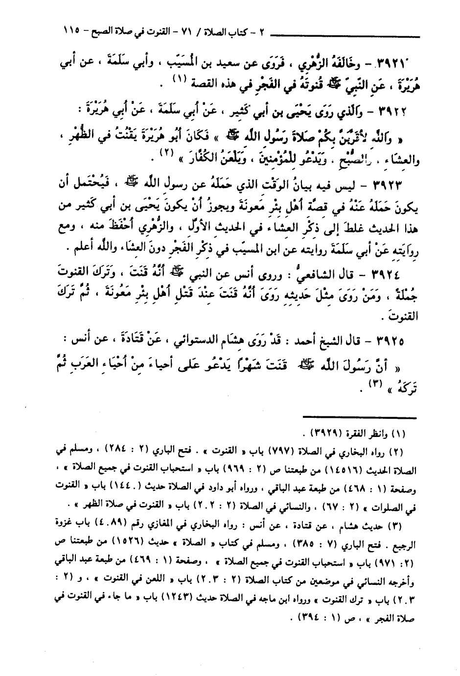 3926 - هَكَذَا مُطْلَقًا كَمَا قَالَ الشَّافِعِيُّ: ثُمَّ فِي رِوَايَةِ إِسْحَاقَ بْنِ عَبْدِ اللَّهِ بْنِ أَبِي طَلْحَةَ، وَأَبِي مِجْلَزٍ، وَأَنَسِ بْنِ سِيرِينَ، وَعَاصِمٍ الْأَحْوَلِ: مَا دَلَّ عَلَى أَنَّ ذَلِكَ كَانَ عِنْدَ قَتْلِ أَهْلِ بِئْرِ مَعُونَةَ