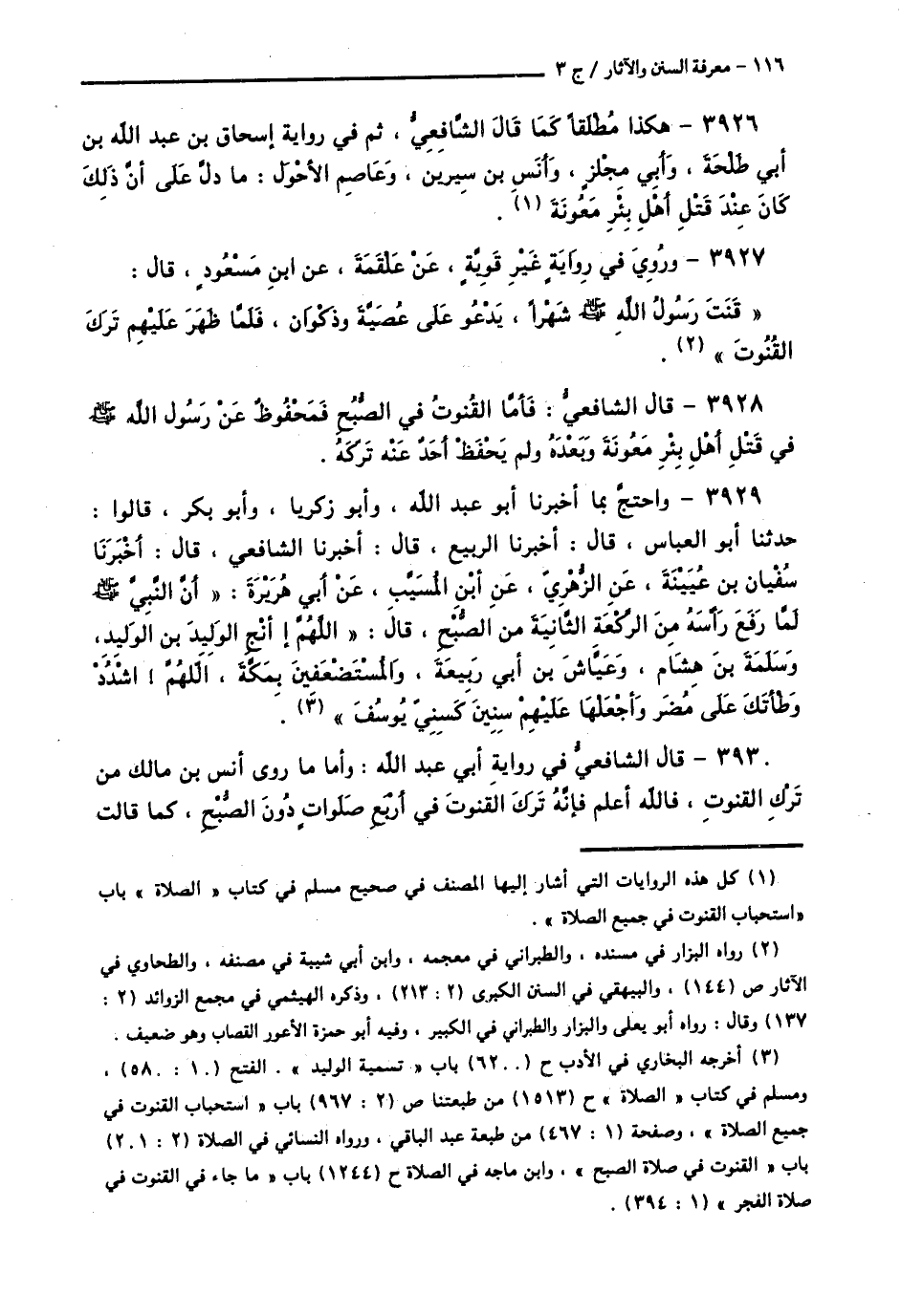 3928 - قَالَ الشَّافِعِيُّ: فَأَمَّا الْقُنُوتُ فِي الصُّبْحِ، فَمَحْفُوظٌ عَنْ رَسُولِ اللَّهِ صَلَّى اللهُ عَلَيْهِ وَسَلَّمَ فِي قَتْلِ أَهْلِ بِئْرِ مَعُونَةَ، وَبَعْدَهُ، وَلَمْ يَحْفَظْ أَحَدٌ عَنْهُ تَرْكَهُ