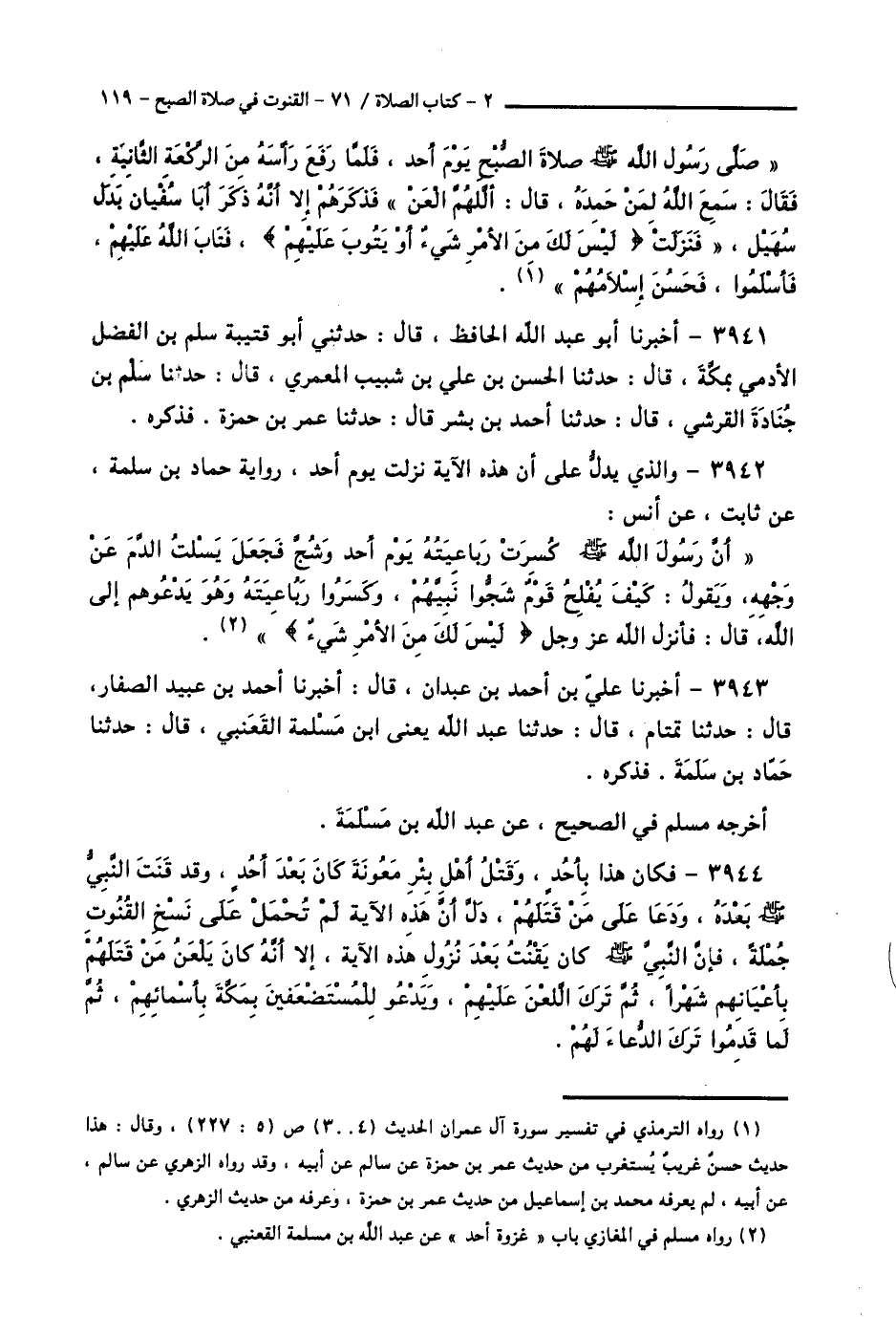 3944 - فَكَانَ هَذَا بِأُحُدٍ، وَقَتْلُ أَهْلِ بِئْرِ مَعُونَةَ، كَانَ بَعْدَ أُحُدٍ، وَقَدْ قَنَتَ النَّبِيُّ صَلَّى اللهُ عَلَيْهِ وَسَلَّمَ بَعْدَهُ، وَدَعَا عَلَى مَنْ قَتَلَهُمْ، دَلَّ أَنَّ هَذِهِ الْآيَةَ، لَمْ تُحْمَلْ عَلَى نَسْخِ الْقُنُوتِ جُمْلَةً، فَإِنَّ النَّبِيَّ صَلَّى اللهُ عَلَيْهِ وَسَلَّمَ كَانَ يَقْنُتُ بَعْدَ نُزُولِ هَذِهِ الْآيَةِ، إِلَّا أَنَّهُ كَانَ يَلْعَنُ مَنْ قَتَلَهُمْ بِأَعْيَانِهِمْ شَهْرًا، ثُمَّ تَرَكَ اللَّعْنَ عَلَيْهِمْ، وَيَدْعُو لِلْمُسْتَضْعَفِينَ بِمَكَّةَ بِأَسْمَائِهِمْ، ثُمَّ لَمَّا قَدِمُوا تَرَكَ الدُّعَاءَ لَهُمْ