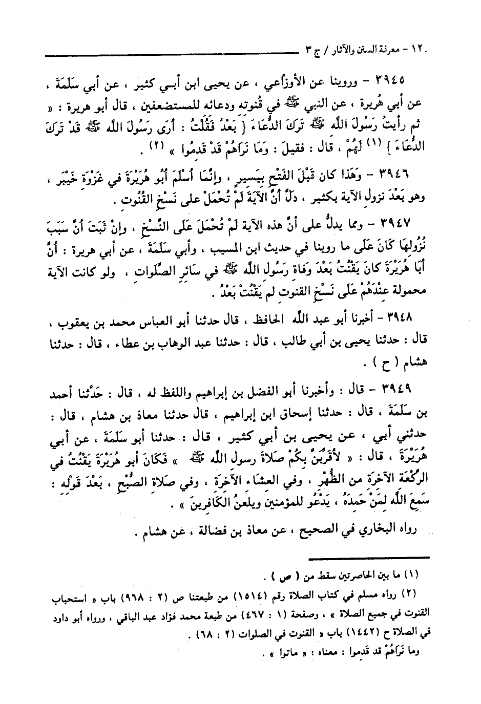3949 - قَالَ: وَأَخْبَرَنَا أَبُو الْفَضْلِ بْنُ إِبْرَاهِيمَ، وَاللَّفْظُ لَهُ، قَالَ: حَدَّثَنَا أَحْمَدُ بْنُ سَلَمَةَ قَالَ: حَدَّثَنَا إِسْحَاقُ بْنُ إِبْرَاهِيمَ قَالَ: حَدَّثَنَا مُعَاذُ بْنُ هِشَامٍ قَالَ: حَدَّثَنِي أَبِي، عَنْ يَحْيَى بْنِ أَبِي كَثِيرٍ قَالَ: حَدَّثَنَا أَبُو سَلَمَةَ، عَنْ أَبِي هُرَيْرَةَ قَالَ: § «لَأُقَرِّبَنَّ بِكُمْ صَلَاةَ رَسُولِ اللَّهِ صَلَّى اللهُ عَلَيْهِ وَسَلَّمَ» فَكَانَ أَبُو هُرَيْرَةَ، يَقْنُتُ فِي الرَّكْعَةِ الْآخِرَةِ مِنَ الظُّهْرِ، وَفِي الْعِشَاءِ الْآخِرَةِ، وَفِي صَلَاةِ الصُّبْحِ، بَعْدَ قَوْلِهِ: «سَمِعَ اللَّهُ لِمَنْ حَمِدَهُ»، يَدْعُو لِلْمُؤْمِنِينَ، وَيَلْعَنُ الْكَافِرِينَ رَوَاهُ الْبُخَارِيُّ فِي الصَّحِيحِ، عَنْ مُعَاذِ بْنِ فَضَالَةَ، عَنْ هِشَامٍ -[121]-، وَرَوَاهُ مُسْلِمٌ عَنْ مُحَمَّدِ بْنِ مُثَنَّى، عَنْ مُعَاذِ بْنِ هِشَامٍ