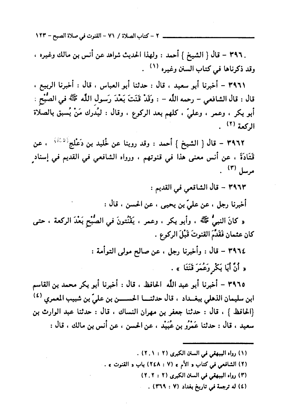 3963 - قَالَ الشَّافِعِيُّ فِي الْقَدِيمِ: أَخْبَرَنَا رَجُلٌ، عَنْ عَلِيِّ بْنِ يَحْيَى، عَنِ الْحَسَنِ قَالَ: «كَانَ النَّبِيُّ صَلَّى اللهُ عَلَيْهِ وَسَلَّمَ، وَأَبُو بَكْرٍ، وَعُمَرُ، §يَقْنُتُونَ فِي الصُّبْحِ بَعْدَ الرَّكْعَةِ، حَتَّى كَانَ عُثْمَانُ، فَقَدَّمَ الْقُنُوتَ قَبْلَ الرُّكُوعِ»