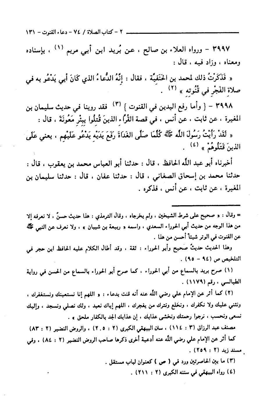 3998 - وَأَمَّا رَفْعُ الْيَدَيْنِ فِي الْقُنُوتِ، فَقَدْ رُوِّينَا فِي حَدِيثِ سُلَيْمَانَ بْنِ الْمُغِيرَةِ، عَنْ ثَابِتٍ، عَنْ أَنَسٍ فِي قِصَّةِ الْقُرَّاءِ، الَّذِينَ قُتِلُوا بِبِئْرِ مَعُونَةَ قَالَ: لَقَدْ رَأَيْتُ رَسُولَ اللَّهِ صَلَّى اللهُ عَلَيْهِ وَسَلَّمَ «كُلَّمَا صَلَّى الْغَدَاةَ، §رَفَعَ يَدَيْهِ يَدْعُو عَلَيْهِمْ، يَعْنِي عَلَى الَّذِينَ قَتَلُوهُمْ» أَخْبَرَنَاهُ أَبُو عَبْدِ اللَّهِ الْحَافِظُ قَالَ: حَدَّثَنَا أَبُو الْعَبَّاسِ مُحَمَّدُ بْنُ يَعْقُوبَ قَالَ: حَدَّثَنَا مُحَمَّدُ بْنُ إِسْحَاقَ الصَّغَانِيُّ قَالَ: حَدَّثَنَا عَفَّانُ قَالَ: حَدَّثَنَا سُلَيْمَانُ بْنُ الْمُغِيرَةِ، عَنْ ثَابِتٍ، عَنْ أَنَسٍ، فَذَكَرَهُ