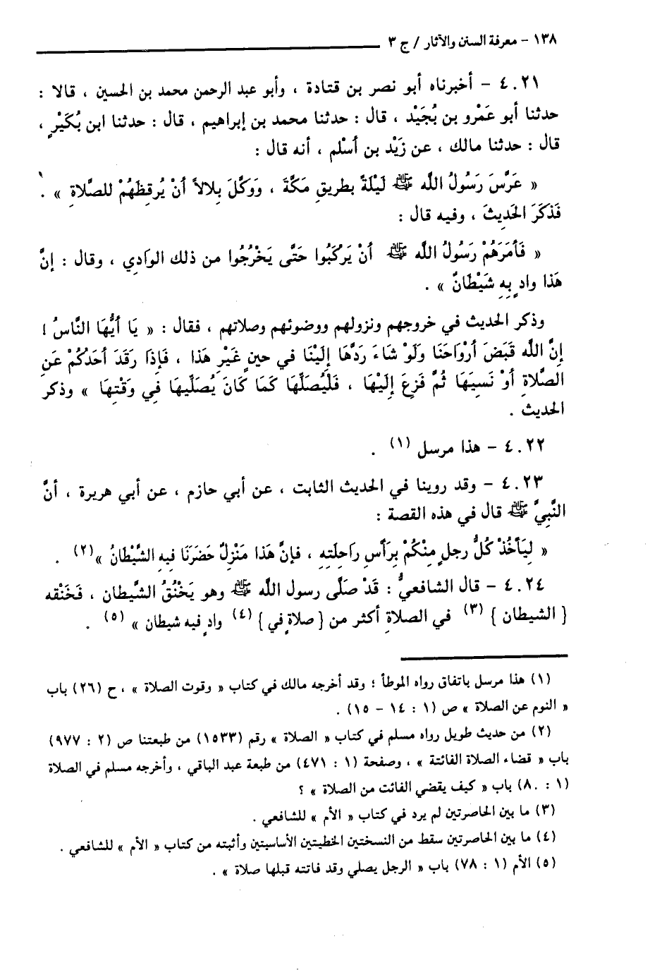 4021 - أَخْبَرَنَاهُ أَبُو نَصْرِ بْنُ قَتَادَةَ، وَأَبُو عَبْدِ الرَّحْمَنِ مُحَمَّدُ بْنُ الْحُسَيْنِ قَالَا: حَدَّثَنَا أَبُو عَمْرِو بْنُ بُجَيْدٍ قَالَ: حَدَّثَنَا مُحَمَّدُ بْنُ إِبْرَاهِيمَ قَالَ: حَدَّثَنَا ابْنُ بُكَيْرٍ قَالَ: حَدَّثَنَا مَالِكٌ، عَنْ زَيْدِ بْنِ أَسْلَمَ، أَنَّهُ قَالَ: عَرَّسَ رَسُولُ اللَّهِ صَلَّى اللهُ عَلَيْهِ وَسَلَّمَ، لَيْلَةً بِطَرِيقِ مَكَّةَ، وَوَكَّلَ بِلَالًا، أَنْ يُوقِظَهُمْ لِلصَّلَاةِ، فَذَكَرَ الْحَدِيثَ، وَفِيهِ قَالَ: فَأَمَرَهُمْ رَسُولُ اللَّهِ صَلَّى اللهُ عَلَيْهِ وَسَلَّمَ، أَنْ يَرْكَبُوا، حَتَّى يَخْرُجُوا مَنْ ذَلِكَ الْوَادِي، وَقَالَ: «إِنَّ هَذَا وَادٍ بِهِ شَيْطَانٌ» , وَذَكَرَ الْحَدِيثَ فِي خُرُوجِهِمْ، وَنُزُولِهِمْ، وَوُضُوئِهِمْ، وَصَلَاتِهِمْ، فَقَالَ: «يَا أَيُّهَا النَّاسُ إِنَّ §اللَّهَ قَبَضَ أَرْوَاحَنَا، وَلَوْ شَاءَ رَدَّهَا إِلَيْنَا فِي حِينٍ غَيْرِ هَذَا، فَإِذَا رَقَدَ أَحَدُكُمْ عَنِ الصَّلَاةِ، أَوْ نَسِيَهَا، ثُمَّ فَزِعَ إِلَيْهَا، فَلْيُصَلِّهَا كَمَا كَانَ يُصَلِّيهَا فِي وَقْتِهَا»، وَذَكَرَ الْحَدِيثَ،