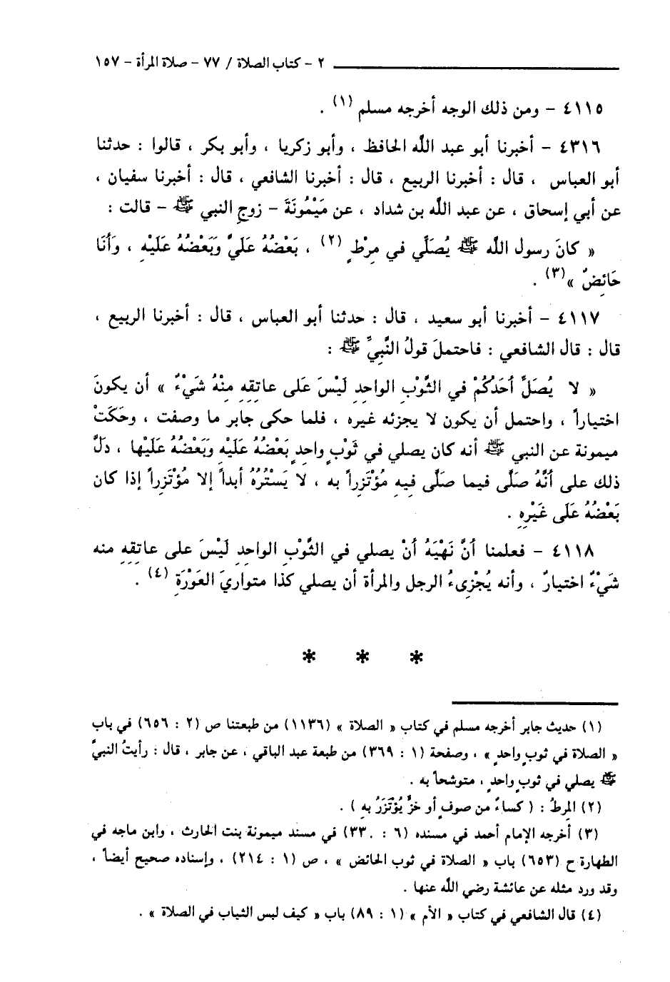4117 - أَخْبَرَنَا أَبُو سَعِيدٍ قَالَ: حَدَّثَنَا أَبُو الْعَبَّاسِ قَالَ: أَخْبَرَنَا الرَّبِيعُ قَالَ: قَالَ الشَّافِعِيُّ: فَاحْتَمَلَ قَوْلُ النَّبِيِّ صَلَّى اللهُ عَلَيْهِ وَسَلَّمَ: § «لَا يُصَلِّ أَحَدُكُمْ فِي الثَّوْبِ الْوَاحِدِ لَيْسَ عَلَى عَاتِقِهِ مِنْهُ شَيْءٌ»، أَنْ يَكُونَ اخْتِيَارًا، وَاحْتَمَلَ أَنْ يَكُونَ لَا يُجْزِئُهُ غَيْرُهُ، فَلَمَّا حَكَى جَابِرٌ مَا وَصَفَتْ، وَحَكَتْ مَيْمُونَةُ عَنِ النَّبِيِّ صَلَّى اللهُ عَلَيْهِ وَسَلَّمَ، أَنَّهُ كَانَ يُصَلِّي فِي ثَوْبٍ وَاحِدٍ بَعْضُهُ عَلَيْهِ، وَبَعْضُهُ عَلَيْهَا، دَلَّ ذَلِكَ عَلَى أَنَّهُ صَلَّى فِيمَا صَلَّى فِيهِ مُؤْتَزِرًا بِهِ، لَا يَسْتُرُهُ أَبَدًا إِلَّا مُؤْتَزِرًا، إِذَا كَانَ بَعْضُهُ عَلَى غَيْرِهِ،