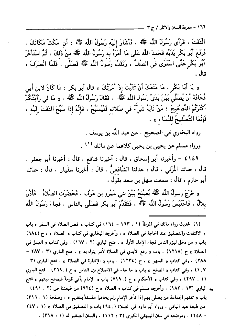 4149 - وَأَخْبَرَنَا أَبُو إِسْحَاقَ قَالَ: أَخْبَرَنَا شَافِعٌ قَالَ: أَخْبَرَنَا أَبُو جَعْفَرٍ قَالَ: حَدَّثَنَا الْمُزَنِيُّ قَالَ: حَدَّثَنَا الشَّافِعِيُّ قَالَ: أَخْبَرَنَا سُفْيَانُ قَالَ: حَدَّثَنَا أَبُو حَازِمٍ قَالَ: سَمِعْتُ سَهْلَ بْنَ سَعْدٍ، يَقُولُ: خَرَجَ رَسُولُ اللَّهِ صَلَّى اللهُ عَلَيْهِ وَسَلَّمَ، يُصْلِحُ بَيْنَ بَنِي عَمْرِو بْنِ عَوْفٍ، فَحَضَرَتِ الصَّلَاةُ، فَأَذَّنَ بِلَالٌ، فَاحْتَبَسَ رَسُولُ اللَّهِ صَلَّى اللهُ عَلَيْهِ وَسَلَّمَ، فَتَقَدَّمَ أَبُو بَكْرٍ، فَصَلَّى بِالنَّاسِ، فَجَاءَ رَسُولُ اللَّهِ صَلَّى اللهُ عَلَيْهِ وَسَلَّمَ -[167]-، يَتَخَلَّلُ الصُّفُوفَ، فَلَمَّا انْتَهَى إِلَى الصَّفِّ الَّذِي يَلِي أَبَا بَكْرٍ، أَخَذَ النَّاسُ فِي التَّصْفِيقِ، وَكَانَ أَبُو بَكْرٍ رَجُلًا لَا يَلْتَفِتُ فِي الصَّلَاةِ، فَلَمَّا سَمِعَ رَسُولُ اللَّهِ صَلَّى اللهُ عَلَيْهِ وَسَلَّمَ الْتَفَتَ، فَأَبْصَرَ رَسُولَ اللَّهِ صَلَّى اللهُ عَلَيْهِ وَسَلَّمَ، فَأَشَارَ إِلَيْهِ رَسُولُ اللَّهِ صَلَّى اللهُ عَلَيْهِ وَسَلَّمَ، أَنِ اثْبُتْ، فَرَفَعَ أَبُو بَكْرٍ رَأْسَهُ إِلَى السَّمَاءِ، فَشَكَرَ اللَّهَ وَرَجَعَ الْقَهْقَرَى، وَتَقَدَّمَ رَسُولُ اللَّهِ صَلَّى اللهُ عَلَيْهِ وَسَلَّمَ، فَلَمَّا قَضَى رَسُولُ اللَّهِ صَلَّى اللهُ عَلَيْهِ وَسَلَّمَ صَلَاتَهُ قَالَ: «يَا أَبَا بَكْرٍ، مَا مَنَعَكَ أَنْ تَثْبُتَ حِينَ أَشَرْتُ إِلَيْكَ؟» قَالَ أَبُو بَكْرٍ: مَا كَانَ لِابْنِ أَبِي قُحَافَةَ، أَنْ يُصَلِّيَ بَيْنَ يَدَيْ رَسُولِ اللَّهِ صَلَّى اللهُ عَلَيْهِ وَسَلَّمَ، ثُمَّ انْحَرَفَ رَسُولُ اللَّهِ صَلَّى اللهُ عَلَيْهِ وَسَلَّمَ، إِلَى النَّاسِ، فَقَالَ: " يَا أَيُّهَا النَّاسُ، مَا لَكُمْ حِينَ نَابَكُمْ فِي صَلَاتِكُمْ شَيْءٌ، أَكْثَرْتُمُ التَّصْفِيقَ، إِنَّمَا §التَّصْفِيقُ لِلنِّسَاءِ، وَالتَّسْبِيحُ لِلرِّجَالِ، فَمَنْ نَابَهُ فِي صَلَاتِهِ شَيْءٌ، فَلْيَقُلْ: سُبْحَانَ اللَّهِ "