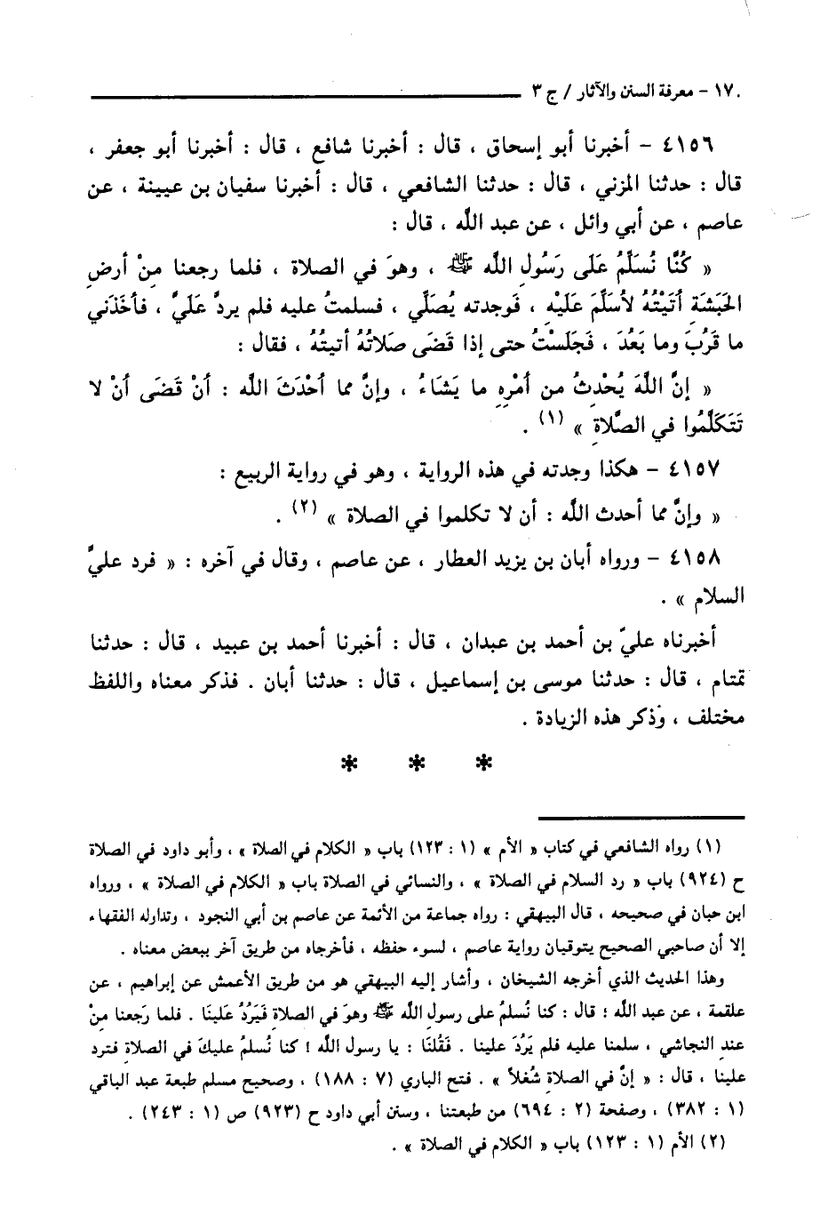 4156 - أَخْبَرَنَا أَبُو إِسْحَاقَ قَالَ: أَخْبَرَنَا شَافِعٌ قَالَ: أَخْبَرَنَا أَبُو جَعْفَرٍ قَالَ: حَدَّثَنَا الْمُزَنِيُّ قَالَ: حَدَّثَنَا الشَّافِعِيُّ قَالَ: أَخْبَرَنَا سُفْيَانُ بْنُ عُيَيْنَةَ، عَنْ عَاصِمٍ، عَنْ أَبِي وَائِلٍ، عَنْ عَبْدِ اللَّهِ قَالَ: كُنَّا نُسَلِّمُ عَلَى رَسُولِ اللَّهِ صَلَّى اللهُ عَلَيْهِ وَسَلَّمَ وَهُوَ فِي الصَّلَاةِ، فَلَمَّا رَجَعْنَا مِنْ أَرْضِ الْحَبَشَةِ أَتَيْتُهُ لِأُسَلِّمَ عَلَيْهِ، فَوَجَدْتُهُ يُصَلِّي، فَسَلَّمْتُ عَلَيْهِ، فَلَمْ يَرُدَّ عَلَيَّ، فَأَخَذَنِي مَا قَرُبَ وَمَا بَعُدَ، فَجَلَسْتُ حَتَّى إِذَا قَضَى صَلَاتَهُ أَتَيْتُهُ، فَقَالَ: «إِنَّ §اللَّهَ يُحْدِثُ مِنْ أَمْرِهِ مَا يَشَاءُ، وَإِنَّ مِمَّا أَحْدَثَ اللَّهُ، أَنْ قَضَى أَنْ لَا تَكَلَّمُوا فِي الصَّلَاةِ»