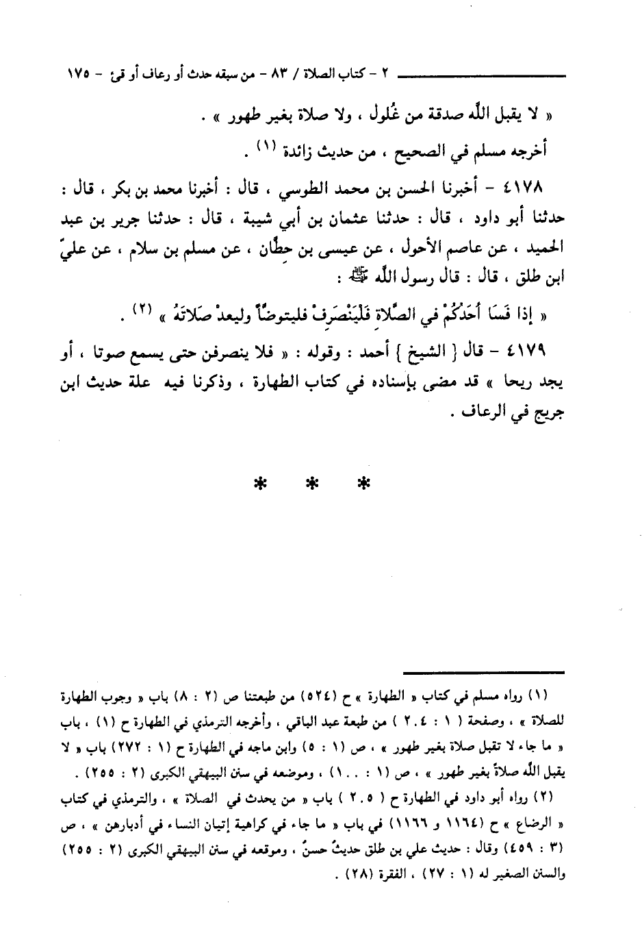 4178 - أَخْبَرَنَا الْحَسَنُ بْنُ مُحَمَّدٍ الطُّوسِيُّ قَالَ: أَخْبَرَنَا مُحَمَّدُ بْنُ بَكْرٍ قَالَ: حَدَّثَنَا أَبُو دَاوُدَ قَالَ: حَدَّثَنَا عُثْمَانُ بْنُ أَبِي شَيْبَةَ قَالَ: حَدَّثَنَا جَرِيرُ بْنُ عَبْدِ الْحَمِيدِ، عَنْ عَاصِمٍ الْأَحْوَلِ، عَنْ عِيسَى بْنِ حِطَّانَ، عَنْ مُسْلِمِ بْنِ سَلَّامٍ، عَنْ عَلِيِّ بْنِ طَلْقٍ قَالَ: قَالَ رَسُولُ اللَّهِ صَلَّى اللهُ عَلَيْهِ وَسَلَّمَ: «§إِذَا فَسَا أَحَدُكُمْ فِي الصَّلَاةِ، فَلْيَنْصَرِفْ، فَلْيَتَوَضَّأْ، وَلْيُعِدْ صَلَاتَهُ»