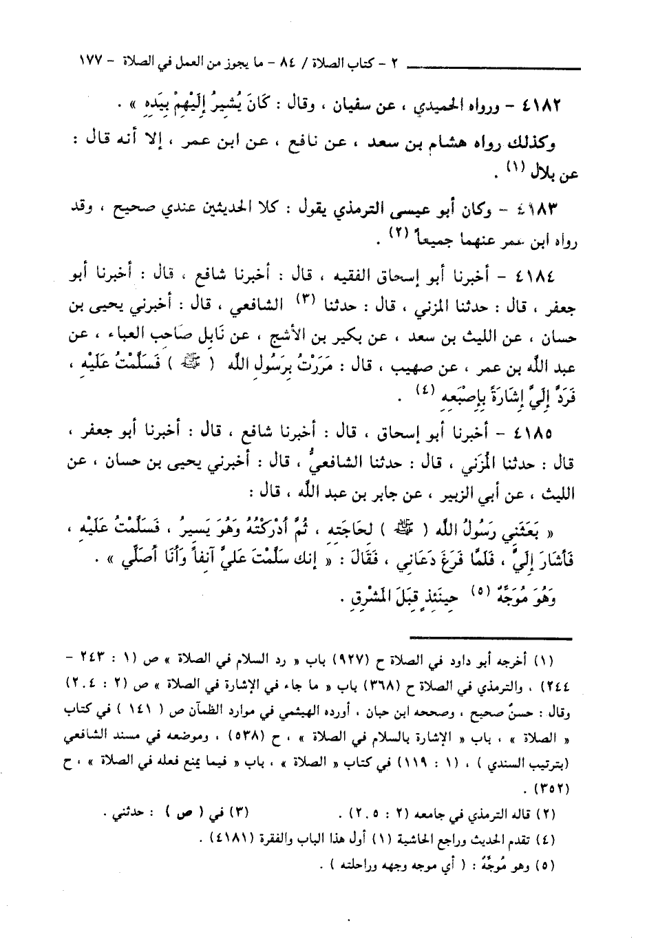 4184 - أَخْبَرَنَا أَبُو إِسْحَاقَ الْفَقِيهُ قَالَ: أَخْبَرَنَا شَافِعٌ قَالَ: أَخْبَرَنَا أَبُو جَعْفَرٍ قَالَ: حَدَّثَنَا الْمُزَنِيُّ قَالَ: حَدَّثَنَا الشَّافِعِيُّ قَالَ: أَخْبَرَنِي يَحْيَى بْنُ حَسَّانَ، عَنِ اللَّيْثِ بْنِ سَعْدٍ، عَنْ بُكَيْرِ بْنِ الْأَشَجِّ، عَنْ نَابِلٍ، صَاحِبِ الْعَبَاءِ، عَنْ عَبْدِ اللَّهِ بْنِ عُمَرَ، عَنْ صُهَيْبٍ قَالَ: «مَرَرْتُ بِرَسُولِ اللَّهِ صَلَّى اللهُ عَلَيْهِ وَسَلَّمَ، فَسَلَّمْتُ عَلَيْهِ، §فَرَدَّ إِلَيَّ إِشَارَةً بِإِصْبَعِهِ»