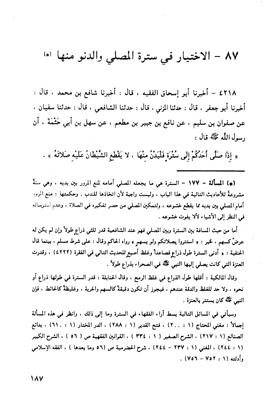 4218 - أَخْبَرَنَا أَبُو إِسْحَاقَ الْفَقِيهُ قَالَ: أَخْبَرَنَا شَافِعُ بْنُ مُحَمَّدٍ قَالَ: أَخْبَرَنَا أَبُو جَعْفَرٍ قَالَ: حَدَّثَنَا الْمُزَنِيُّ، قَالَ: حَدَّثَنَا الشَّافِعِيُّ قَالَ: حَدَّثَنَا سُفْيَانُ، عَنْ صَفْوَانَ بْنِ سُلَيْمٍ، عَنْ نَافِعِ بْنِ جُبَيْرِ بْنِ مُطْعِمٍ، عَنْ سَهْلِ بْنِ أَبِي حَثْمَةَ، أَنَّ رَسُولَ اللَّهِ صَلَّى اللهُ عَلَيْهِ وَسَلَّمَ قَالَ: «§إِذَا صَلَّى أَحَدُكُمْ إِلَى سُتْرَةٍ، فَلْيَدْنُ مِنْهَا، لَا يَقْطَعُ الشَّيْطَانُ عَلَيْهِ صَلَاتَهُ» -[188]-، رَوَاهُ أَبُو دَاوُدَ فِي كِتَابِ السُّنَنِ عَنْ عُثْمَانَ بْنِ أَبِي شَيْبَةَ، وَغَيْرِهِ، عَنْ سُفْيَانَ