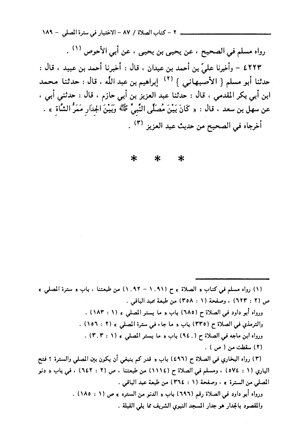 4223 - وَأَخْبَرَنَا عَلِيُّ بْنُ أَحْمَدَ بْنِ عَبْدَانَ قَالَ: أَخْبَرَنَا أَحْمَدُ بْنُ عُبَيْدٍ قَالَ: حَدَّثَنَا أَبُو مُسْلِمٍ الْأَصْبَهَانِيُّ إِبْرَاهِيمُ بْنُ عَبْدِ اللَّهِ قَالَ: حَدَّثَنَا مُحَمَّدُ بْنُ أَبِي بَكْرٍ الْمُقَدَّمِيُّ قَالَ: حَدَّثَنَا عَبْدُ الْعَزِيزِ بْنُ أَبِي حَازِمٍ قَالَ: حَدَّثَنِي أَبِي، عَنْ سَهْلِ بْنِ سَعْدٍ قَالَ: «كَانَ §بَيْنَ مُصَلَّى النَّبِيِّ صَلَّى اللهُ عَلَيْهِ وَسَلَّمَ، وَبَيْنَ الْجِدَارِ مَمَرُّ الشَّاةِ» أَخْرَجَاهُ فِي الصَّحِيحِ مِنْ حَدِيثِ عَبْدِ الْعَزِيزِ