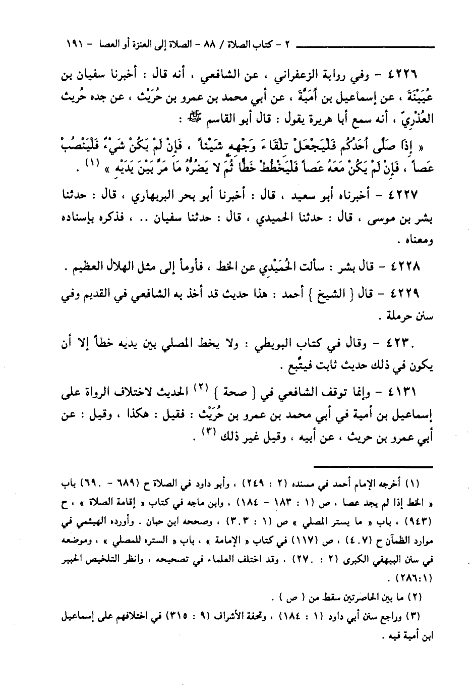 4226 - وَفِي رِوَايَةِ الزَّعْفَرَانِيِّ، عَنِ الشَّافِعِيِّ، أَنَّهُ قَالَ: أَخْبَرَنَا سُفْيَانُ بْنُ عُيَيْنَةَ، عَنْ إِسْمَاعِيلَ بْنِ أُمَيَّةَ، عَنْ أَبِي مُحَمَّدِ بْنِ عَمْرِو بْنِ حُرَيْثٍ، عَنْ جَدِّهِ حُرَيْثٍ الْعُذْرِيِّ، أَنَّهُ سَمِعَ أَبَا هُرَيْرَةَ، يَقُولُ: قَالَ أَبُو الْقَاسِمِ صَلَّى اللهُ عَلَيْهِ وَسَلَّمَ: «§إِذَا صَلَّى أَحَدُكُمْ، فَلْيَجْعَلْ تِلْقَاءَ وَجْهِهِ شَيْئًا، فَإِنْ لَمْ يَكُنْ شَيْءٌ، فَلْيَنْصِبْ عَصًا، فَإِنْ لَمْ يَكُنْ مَعَهُ عَصًا، فَلْيَخْطُطْ خَطًّا، ثُمَّ لَا يَضُرُّهُ مَا مَرَّ بَيْنَ يَدَيْهِ»